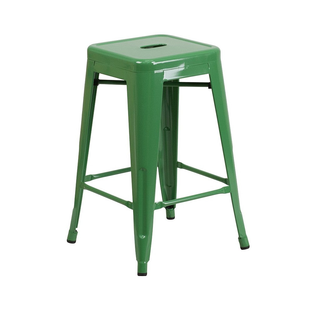 Upgrade the seating in your restaurant, eatery or home with this colorful counter stool with growing popularity. This space-saving stool is stackable making it great for storing. This stool features a backless, lightweight design that allows easy movement from inside areas to the patio or sidewalk to enjoy nice weather. A cross brace underneath the seat adds extra stability and features plastic caps that prevent the finish from scratching when stacked. The legs have protective floor glides that prevent damage to flooring. This all-weather use stool is great for indoor and outdoor settings. For longevity, care should be taken to protect from long periods of wet weather. The unique design of this backless stool gives it the versatility to be used in multiple spaces. [CH-31320-24-GN-GG]