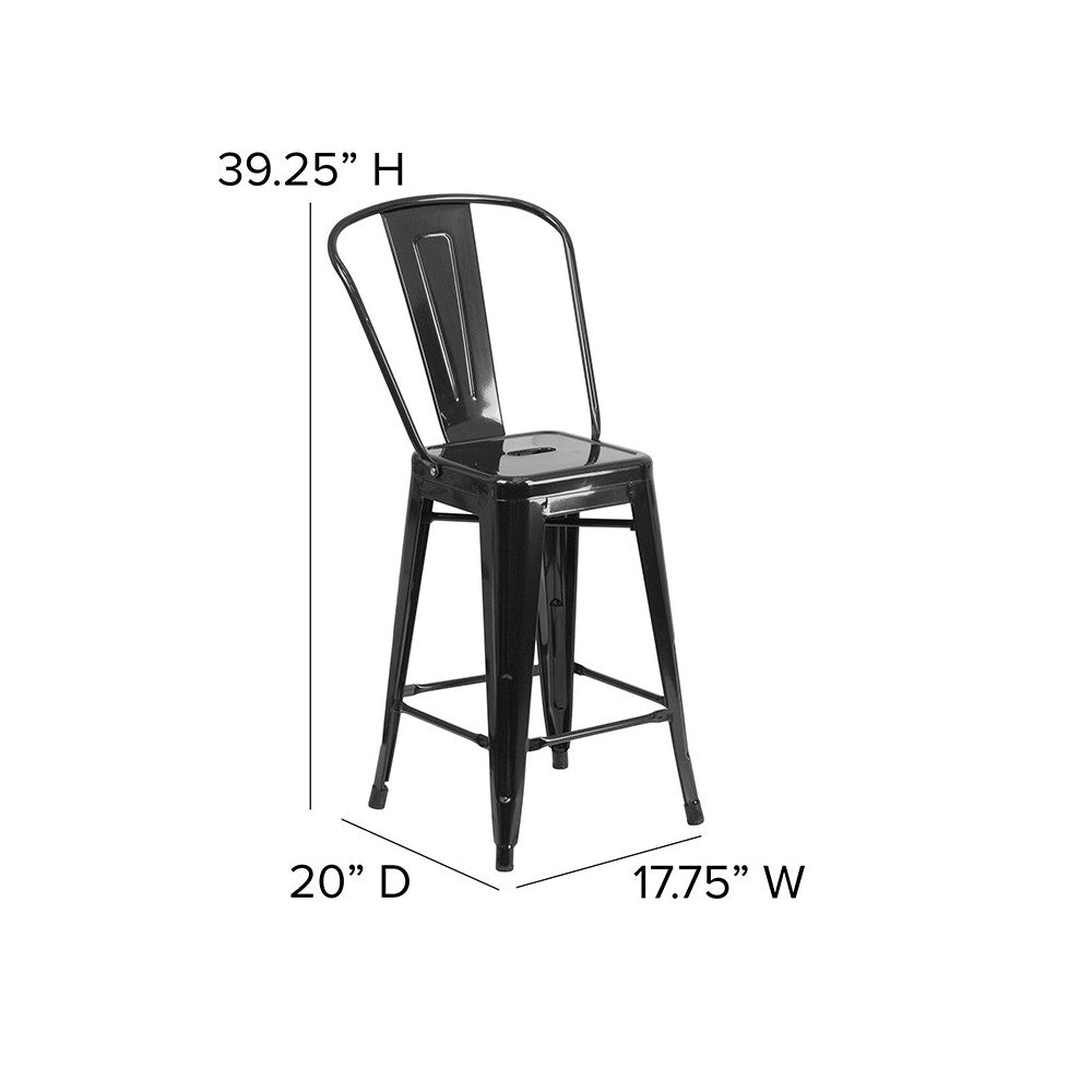Commercial Grade 24" High Black Metal Indoor-Outdoor Counter Height Stool with Removable Back