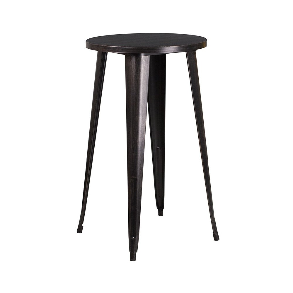 Commercial Grade 24" Round Black-Antique Gold Metal Indoor-Outdoor Bar Table Set with 2 Vertical Slat Back Stools