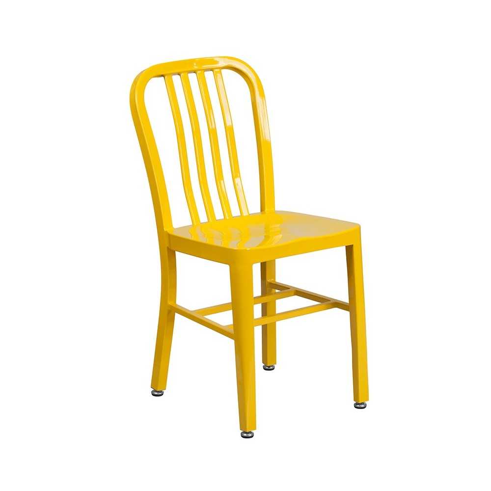 Complete your dining room, restaurant or patio with this chic table and chair set. This colorful set will add a retro-modern look to your home or eatery. Table features a smooth top and protective rubber floor glides. The industrial style chair features an attractive vertical slat back. This 5 piece table set is designed for indoor and outdoor settings. For longevity, care should be taken to protect from long periods of wet weather. The possibilities are endless with the multitude of environments in which you can use this table, for both commercial and residential spaces. [CH-51080TH-4-18VRT-YL-GG]