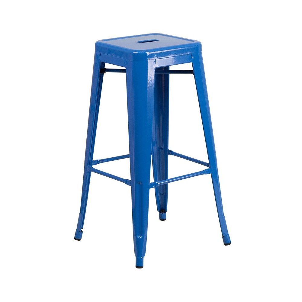 Let the clean lines and simple design of this square, industrial style barstool add a modern appearance to your home or business with this colorful bar height stool. This space-saving stool is stackable making it great for storing. This stool features a backless, lightweight design that is easy to move from your dining room to the patio or sidewalk. A cross brace underneath the seat adds extra stability and features plastic caps that prevent the finish from scratching when stacked. The lower support brace doubles as a footrest and protective floor glides prevent damage to flooring. This all-weather use stool is great for indoor and outdoor settings. For longevity, care should be taken to protect from long periods of wet weather. The unique design of this backless stool gives it the versatility to be used in multiple spaces. [CH-31320-30-BL-GG]