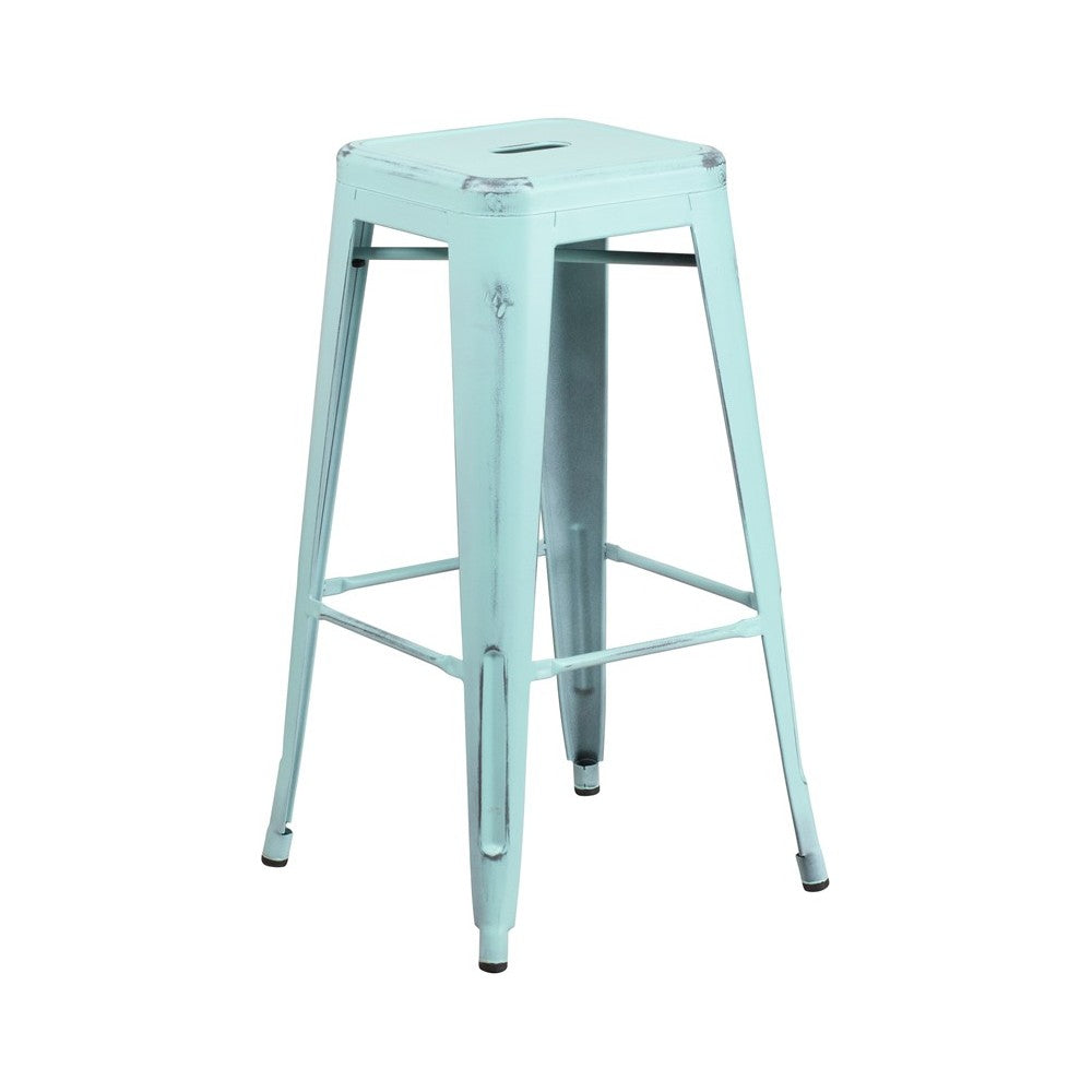 Commercial Grade 30" High Backless Distressed Green-Blue Metal Indoor-Outdoor Barstool