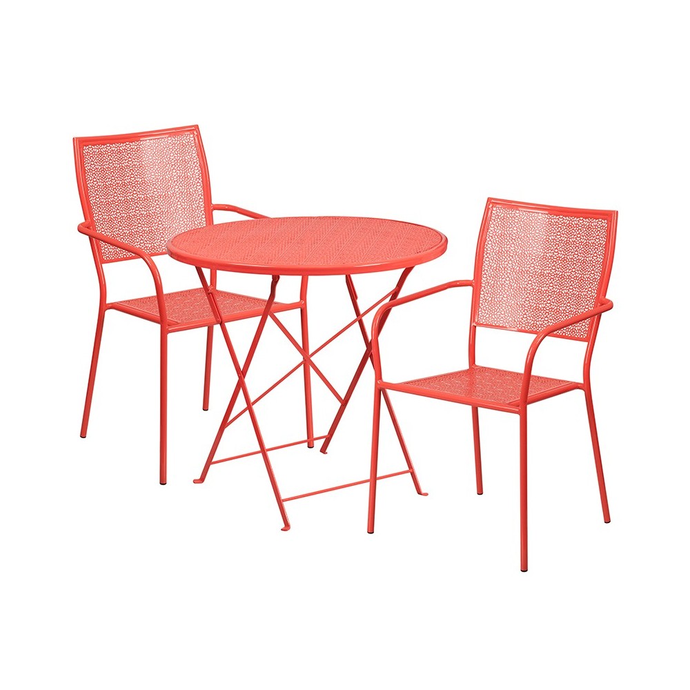 Commercial Grade 30" Round Coral Indoor-Outdoor Steel Folding Patio Table Set with 2 Square Back Chairs