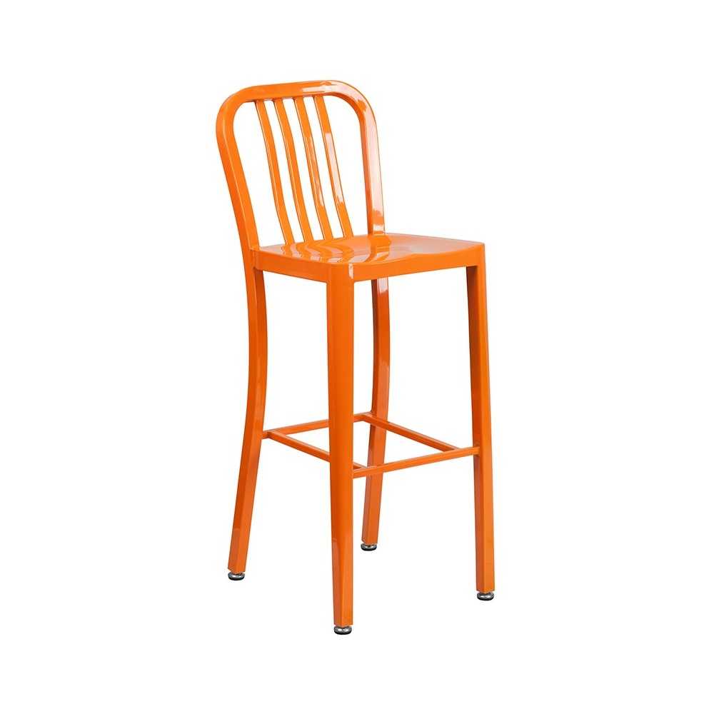 Complete your dining room, restaurant or patio with this chic bar table and chair set. This colorful set will add a retro-modern look to your home or eatery. Table features a smooth top and protective rubber floor glides. The industrial style barstool features an attractive vertical slat back. This 5 piece table set is designed for indoor and outdoor settings. For longevity, care should be taken to protect from long periods of wet weather. The possibilities are endless with the multitude of environments in which you can use this table, for both commercial and residential spaces. [CH-51090BH-4-30VRT-OR-GG]