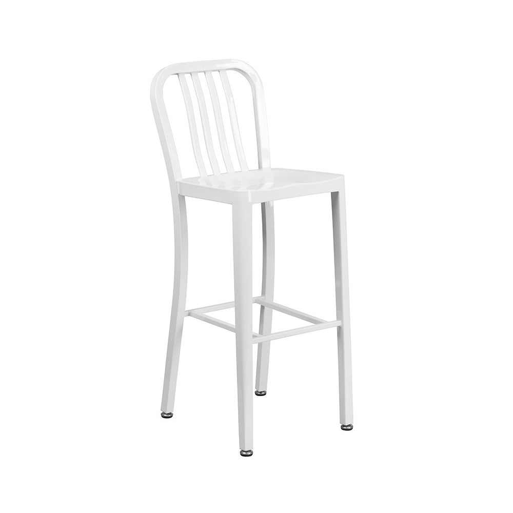 Complete your dining room, restaurant or patio with this chic bar table and chair set. This colorful set will add a retro-modern look to your home or eatery. Table features a smooth top and protective rubber floor glides. The industrial style barstool features an attractive vertical slat back. This 5 piece table set is designed for indoor and outdoor settings. For longevity, care should be taken to protect from long periods of wet weather. The possibilities are endless with the multitude of environments in which you can use this table, for both commercial and residential spaces. [CH-51090BH-4-30VRT-WH-GG]