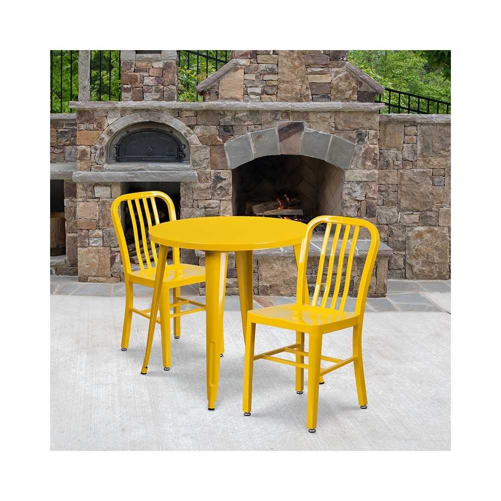 Commercial Grade 30" Round Yellow Metal Indoor-Outdoor Table Set with 2 Vertical Slat Back Chairs