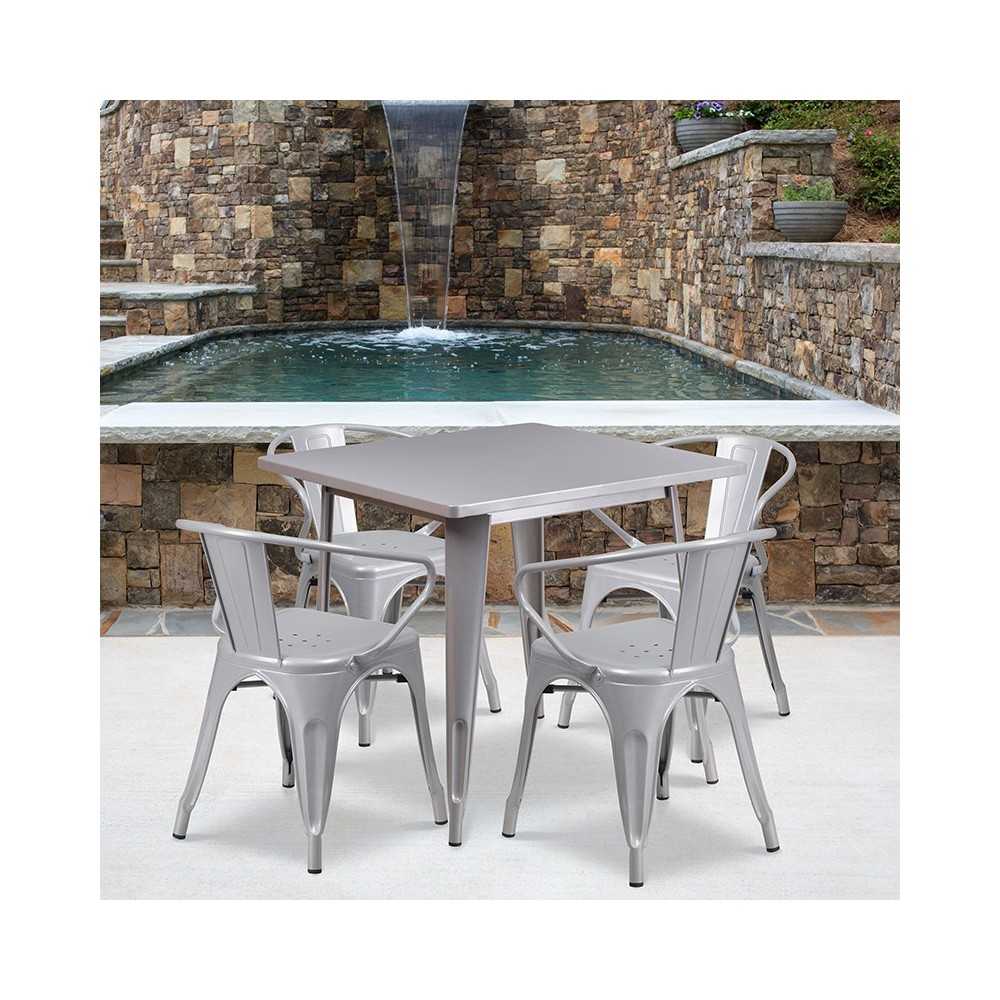 Commercial Grade 31.5" Square Silver Metal Indoor-Outdoor Table Set with 4 Arm Chairs