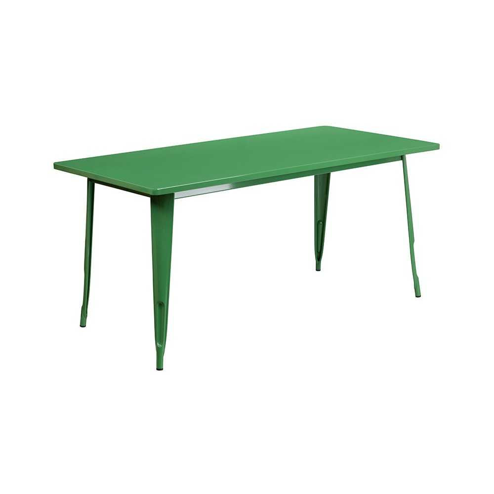 The indoor-outdoor rectangular metal table with four arm chairs will give your dining room or restaurant a cool retro-vintage look. The table top measures 31.5 inches wide by 63 inches long and has a smooth top with a 1 inch edge. A stabilizing brace underneath the top gives this table increased stability while still allowing ample leg room. The arm chairs feature curved backs with a vertical slat, integrated arms, and a cross brace under the seat for added support and stability. Plastic bumpers on the cross brace protect the chairs' finish when stacking them. Drain holes in the center of the seat allow water to drain, preventing rust. A smooth, powder coat finish protects the set from scratches and floor glides protect your floors when you need to move it. Designed for both commercial and residential use, this trendy table set will create a lasting impression whether you're serving customers or playing cards with friends. [ET-CT005-4-70-GN-GG]