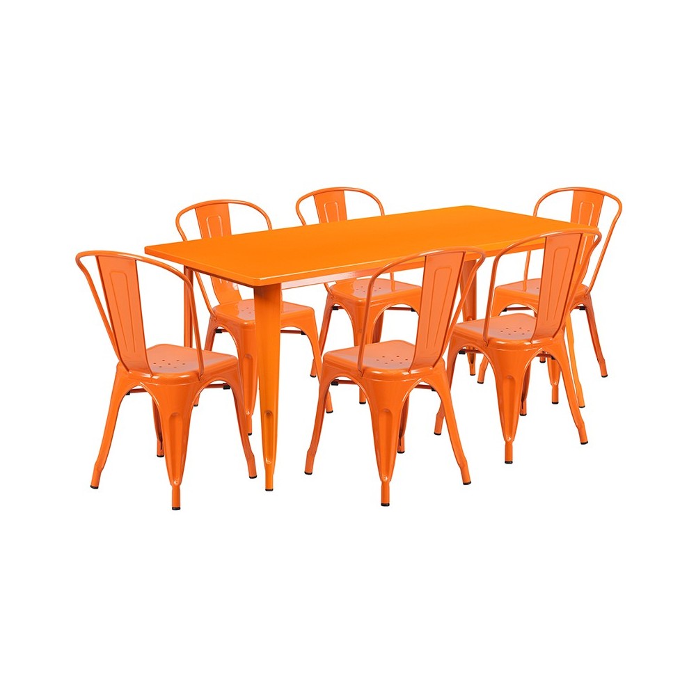 The indoor-outdoor rectangular metal table with six stack chairs will give the dining space in your home or restaurant a cool retro-vintage look. The table top measures 31.5 inches wide by 63 inches long and has a smooth top with a 1 inch edge. A stabilizing brace underneath the top gives this table increased stability while still allowing ample leg room. The bistro style chairs feature curved backs with a vertical slat, and a cross brace under the seat for added support and stability. Plastic bumpers on the cross brace protect the chairs' finish when stacking them. Drain holes in the center of the seat allow water to drain, preventing rust. The smooth, powder coat finish protects the set from scratches and floor glides protect your floors when you need to move it. Designed for both commercial and residential use, this trendy table set will create a lasting impression whether you're serving customers or playing cards with friends. [ET-CT005-6-30-OR-GG]