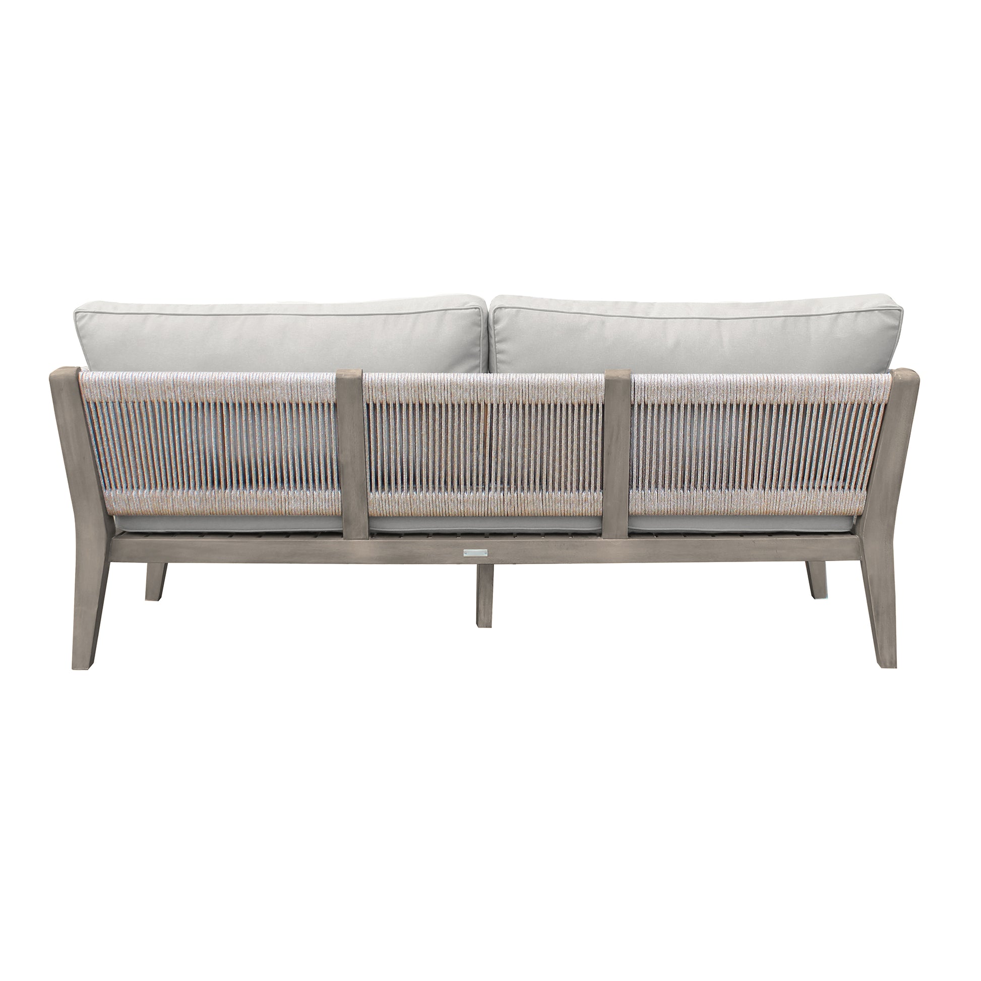 Relax, entertain, or enjoy a conversation with your loved ones while seated in the Condesa 4 Piece Outdoor Patio Furniture Set in Acacia Wood and Rope. This set includes 1 sofa, 1 slatted top coffee table, and 2 lounge chairs. Constructed from acacia wood and rope, the patio furniture set showcases the beauty of using mixed materials with outdoor furniture. The unique weave on the back and arms of the chairs and sofa creates a soft yet modern aesthetic. The rope is rot-proof and resistant to mildew, mold, acids, and alkalis, making it an easy choice for your lawn furniture. This wood patio furniture set is constructed from Acacia wood. Acacia is an extremely dense and durable wood that is hard to damage and is rich in natural oils that help prevent rot. It is also weather resistant and does not absorb much moisture which makes it a great wood for outside furniture. The polyester upholstery is not permeated easily by water. Secondly, polyester resists the types of molds and mildews that will take root in fabrics made of natural fibers. The cushions feature a convenient zipper closure which makes the removal and cleaning of the cushion covers a breeze. Set these pieces together for a cohesive look or use them independently as you see fit! With multiple configuration possibilities, you can always have the best seat in or out of the house. The Condesa patio furniture set with table is a luxurious addition to your patio, backyard, pool area, or screened in porch.