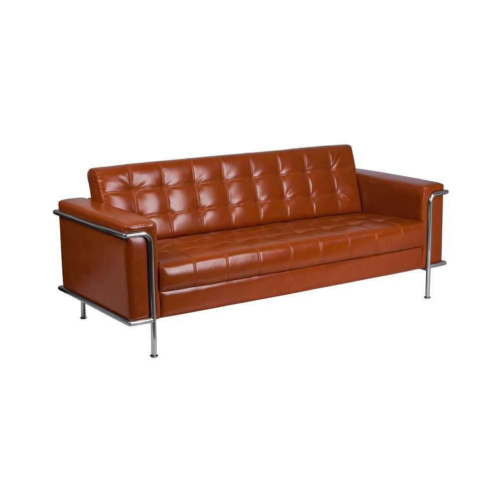 Your office reception space speaks to who your are as a company and this cognac LeatherSoft upholstered sofa with encasing frame makes quite a statement. This trendsetting piece features a straight arm design, and foam filled, tufted, fixed back and seat cushions for exceptional comfort. LeatherSoft is leather and polyurethane for added softness and durability. The integrated stainless steel frame and exposed accent bar not only add style, they are rust resistant and will keep up with the rigors of commercial use. Make a great impression on your clients, customers, and guests with this innovative contemporary sofa. This progressive style seating brings comfort and trend-setting style to your waiting room, reception area or home. [ZB-LESLEY-8090-SOFA-COG-GG]