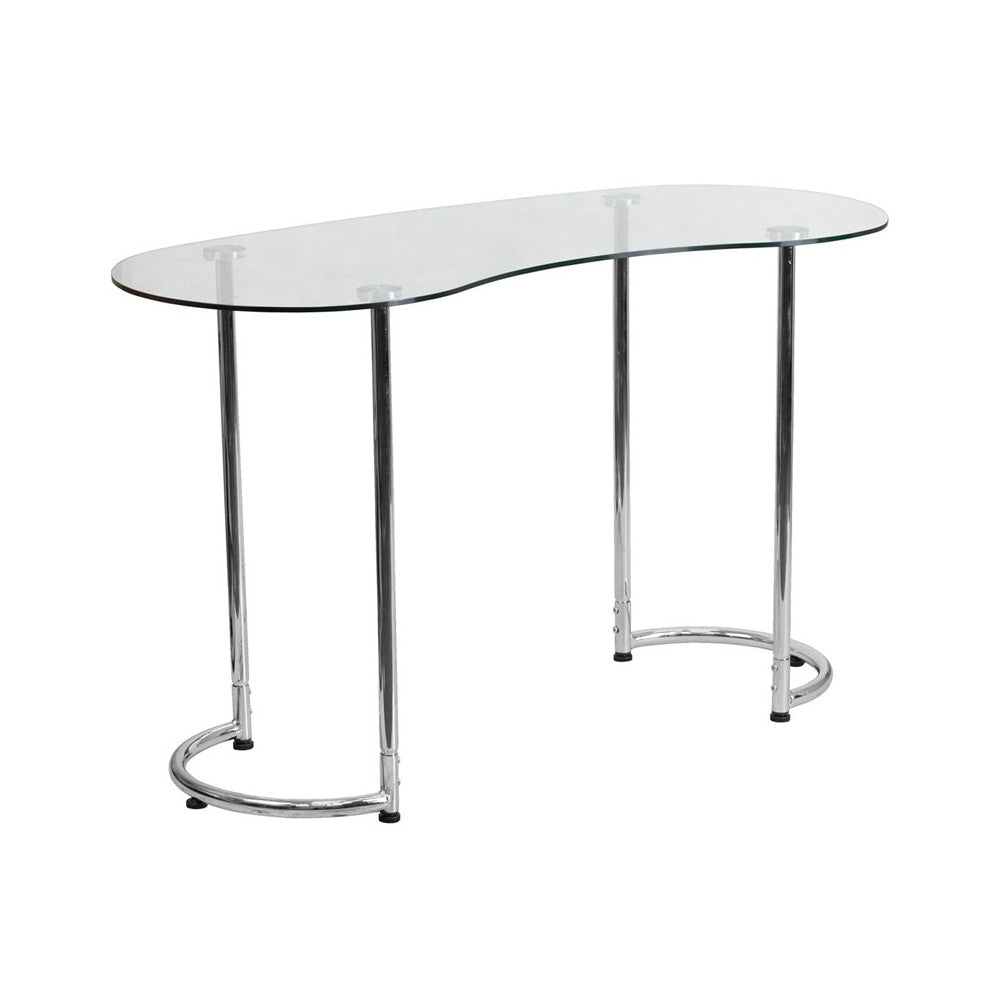 Make a bold statement with this brilliant computer desk boasting a beautiful kidney shaped, clear tempered glass top and chrome frame finish. Rounded support braces at the bottom of the legs match the curve of the desktop and give the desk increased stability. Adjustable floor glides keep the desk from wobbling on uneven floor surfaces and protect your floor by sliding smoothly when you need to move it. This elegant desk is an excellent workspace for writing, studying or displaying photos and keepsakes in your home or office. [NAN-YLCD1235-GG]