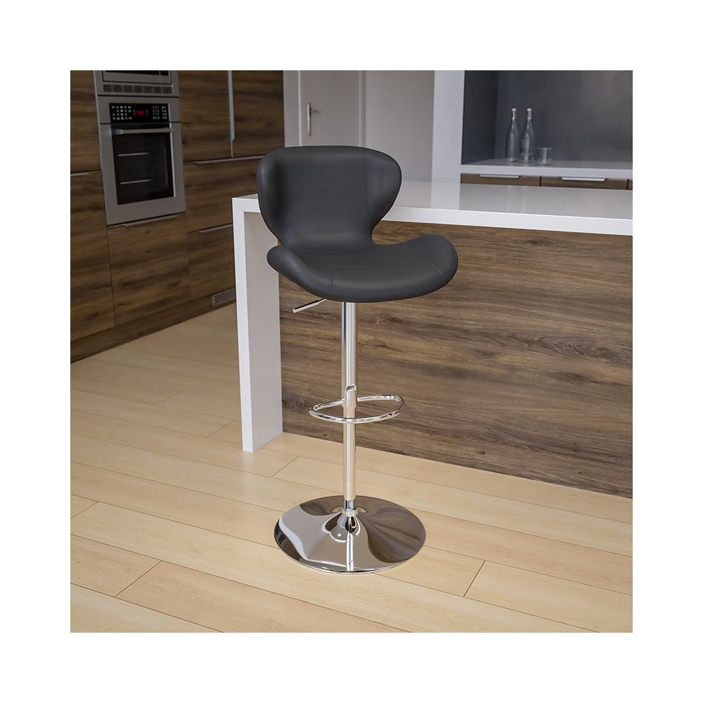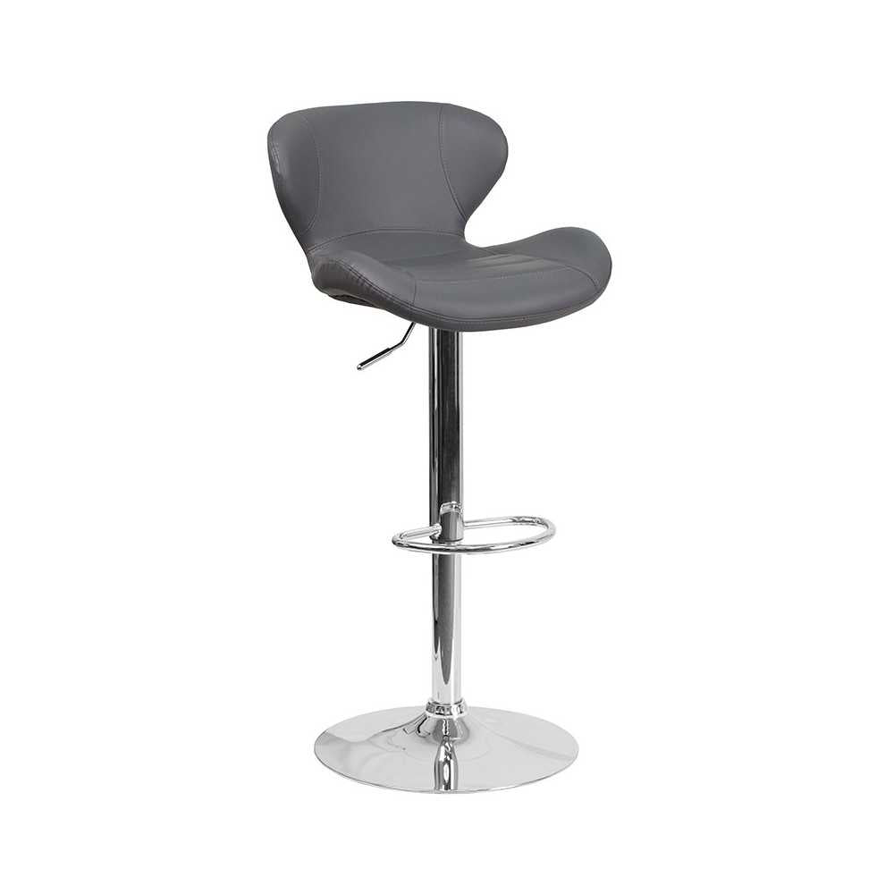 If you are looking for something a little different this gray adjustable height, curved back barstool is the perfect choice. This stool stands out with a curvaceous frame and stylish line stitching throughout the vinyl upholstery and will make an attractive statement in your home. The height adjustable swivel seat adjusts from counter to bar height with the handle located below the seat. The chrome footrest supports your feet and relieves pressure from your legs while also providing a contemporary chic design. The chrome pedestal brings a sleek and shiny look that suits both casual home bars and formal dining spaces. To help protect your floors, the base features an embedded plastic ring. [CH-321-GY-GG]