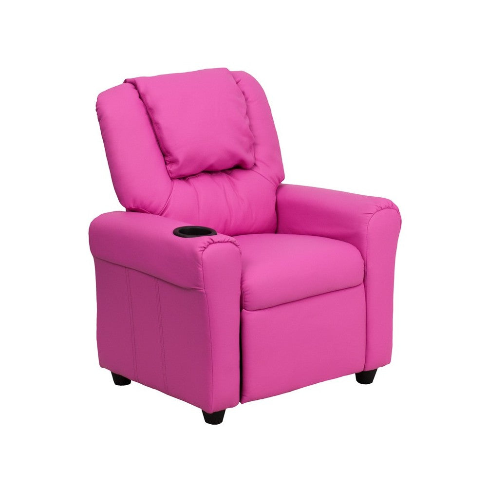 Contemporary Hot Pink Vinyl Kids Recliner with Cup Holder and Headrest