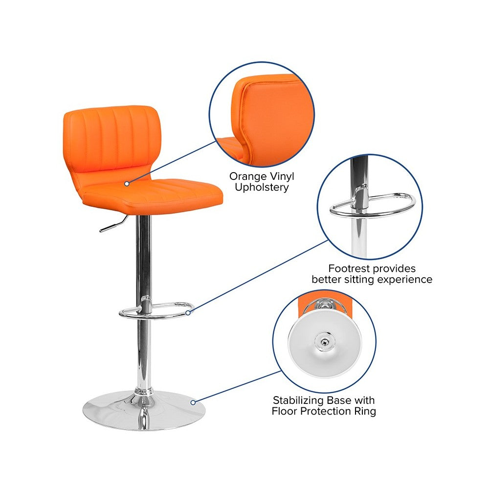 Contemporary Orange Vinyl Adjustable Height Barstool with Vertical Stitch Back and Chrome Base