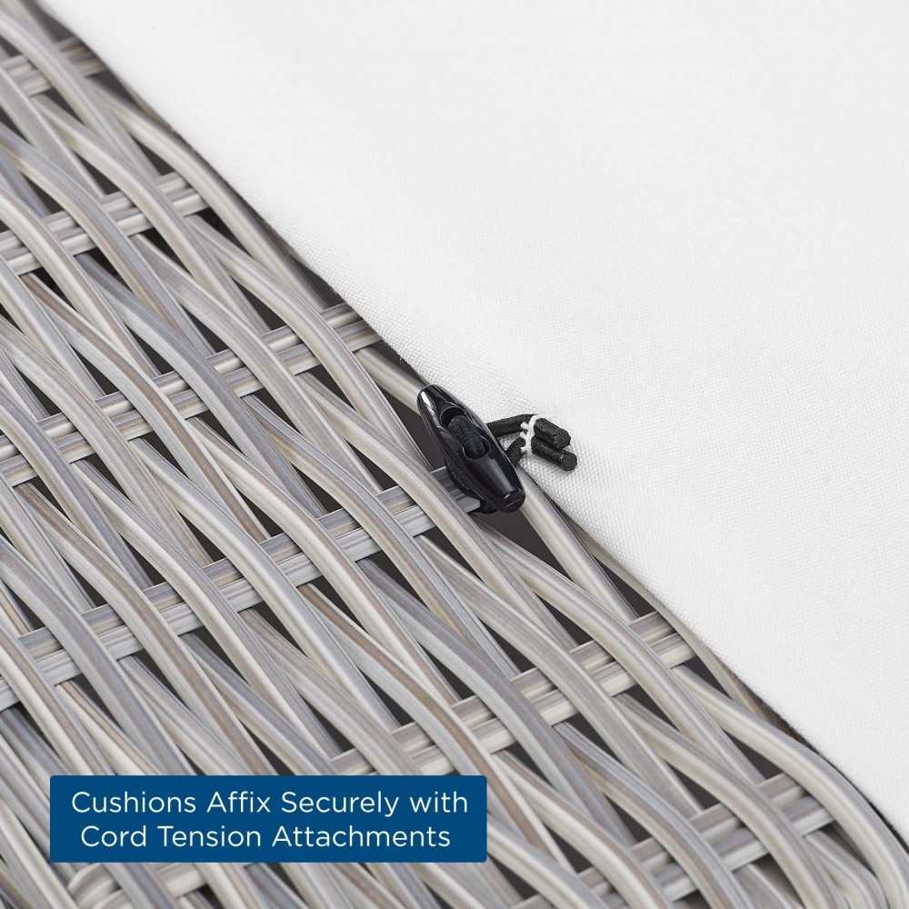 Enjoy fresh air and alfresco relaxation with the Conway Outdoor Patio Wicker Rattan Chaise Lounge Chair. Wrapped in UV-resistant light gray synthetic wicker rattan, this lounge chair boasts organic texture and a neutral hue that brings a calming presence to your outdoor space. With four different recline positions, the frame of this outdoor chaise lounge is crafted with durable powder-coated aluminum and rests on L-shaped legs with plastic foot glides. Thick foam padded cushions covered with washable water-resistant Sunbrella fabric covers offer a comfortable seat and affix securely to the lounge chair with cord tension attachments. Trending aesthetics and a classic design define this outdoor patio furniture collection making it a beautiful addition to any outdoor space including the backyard, patio, porch, balcony, or poolside. Assembly required. Chaise Lounge Weight Capacity: 600 lbs.
