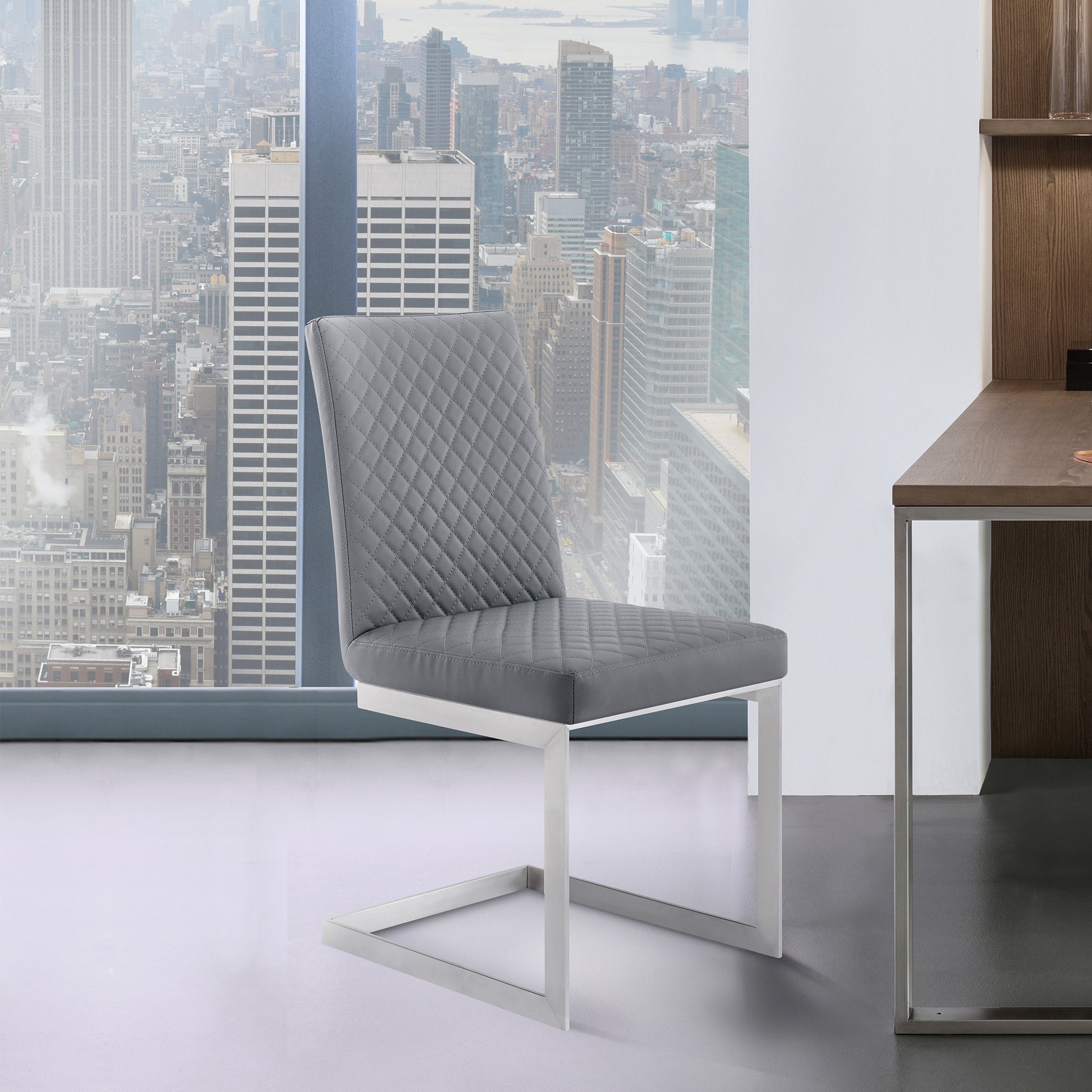 Copen Dining Chair in Brushed Stainless Steel and Gray Faux Leather - Set of 2