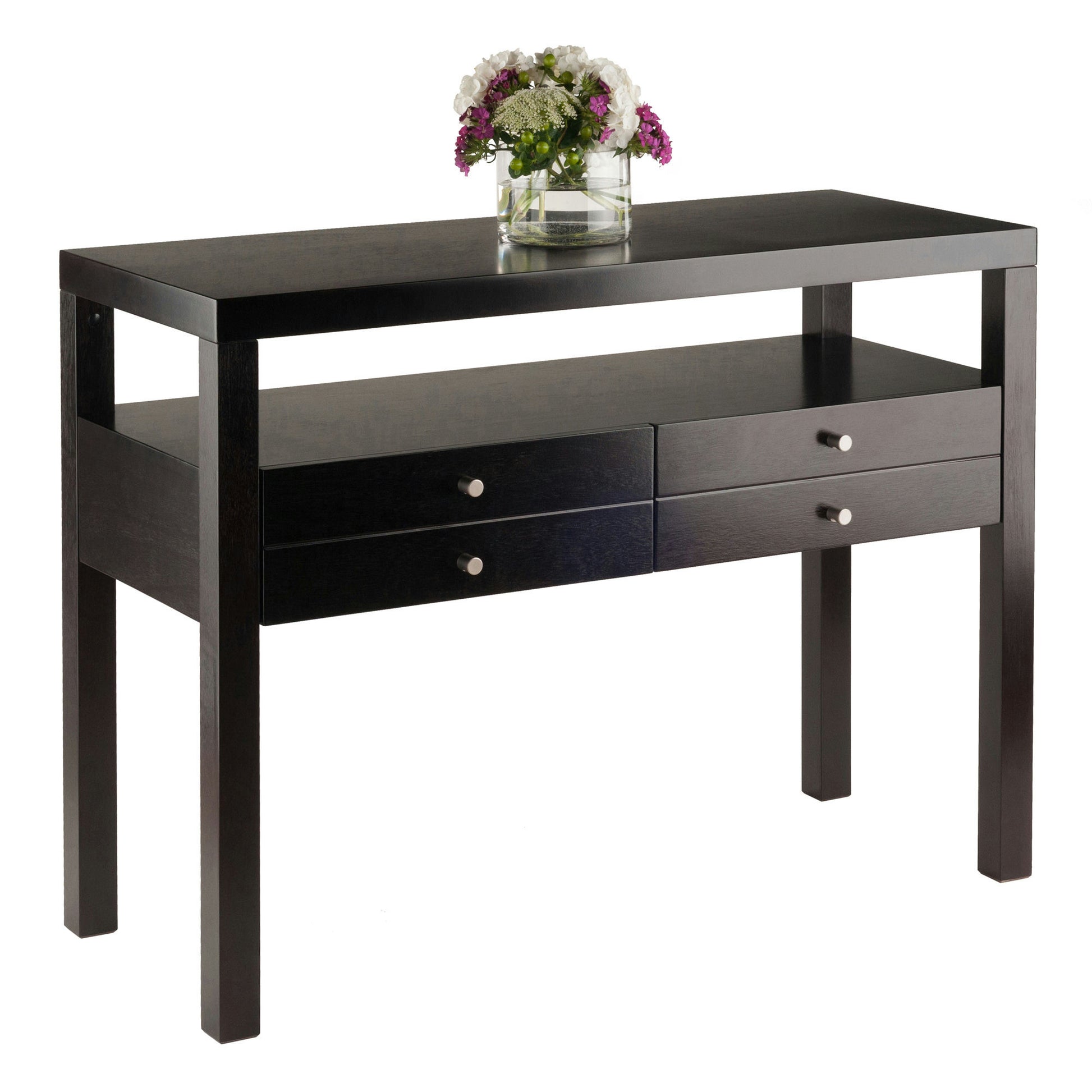 Bring the classic simplicity of Sandinavian design to your entryway, hallway, or dining room with the Copenhagen Console Table. Eye-catching with a lamp or vase in the living room, and practical in the entryway with a basket for keys and gloves near the front door. Use the console to display serveware and keep extra silverware and placemats handy in the dining room. Two drawers with silver satin knob accents provide additional storage. Made of solid and composite wood in a smooth Espresso finish. Overall size is 30"H x 40"W x 17.1"D.