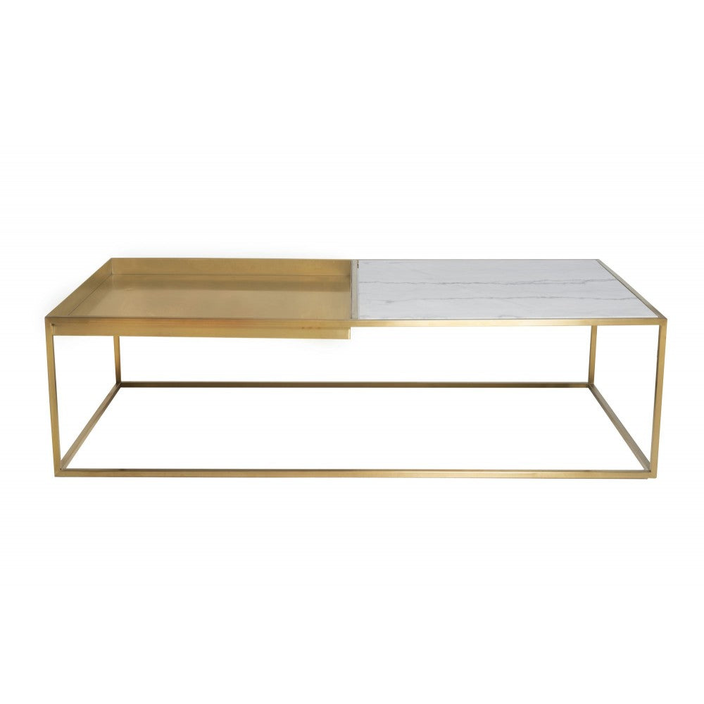 The Corbett coffee table employs minimalist design to great effect employing mixed materials. A delicate frame crafted in brushed gold steel supports a matching square basin connected to an inlaid solid marble surface. Contrast and functionality distinguish this smart geometric design. Each piece of marble is expertly crafted out of a unique piece of natural stone, creating beautiful variations and one-of-a-kind details.