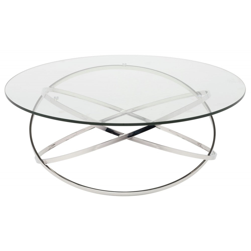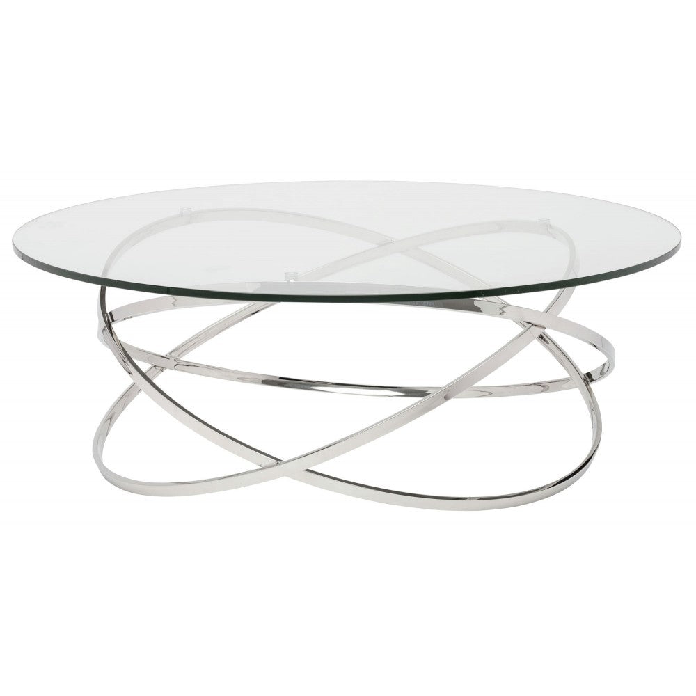 Dynamic, concentric and balanced, the Corel coffee table is a light, open expression of contemporary style. Three intertwined bands of flattened polished stainless steel are woven into a kinetic design supporting a round tempered glass top. The result, delicate and refined.