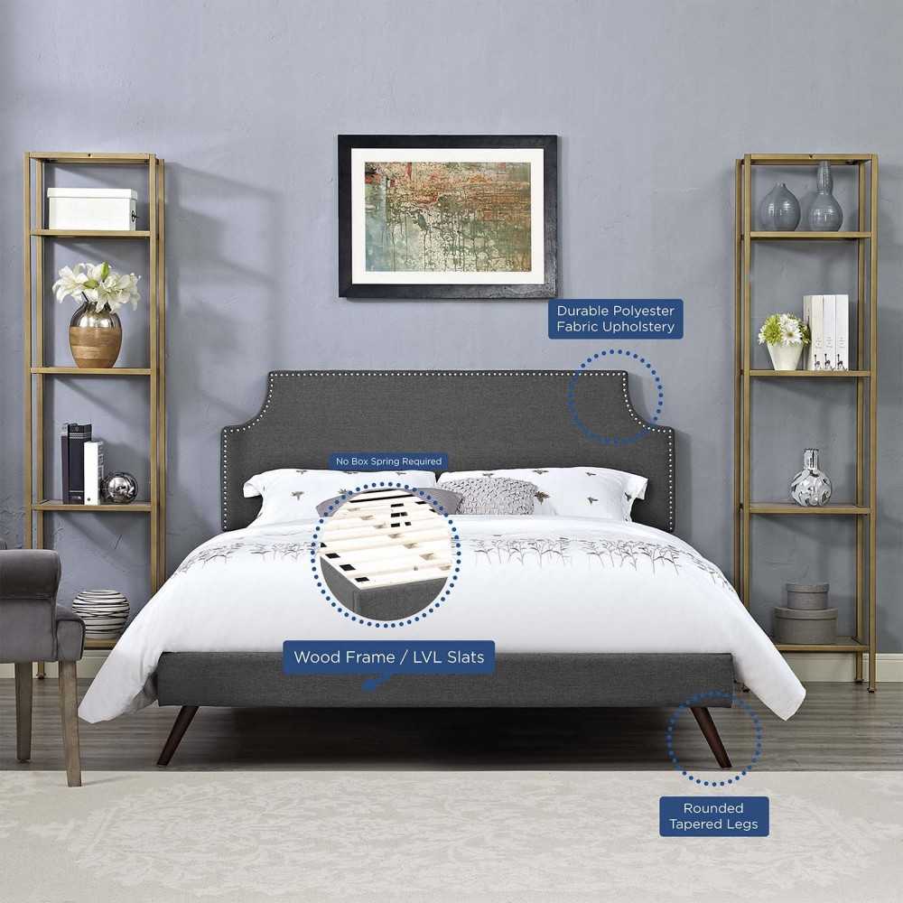 Accelerate your bedroom decor with the Corene Platform Bed. Made with a solid wood frame upholstered in polyester fabric, Corene features tapered wood legs, plastic foot glides, stylish headboard, and ten sturdy wood slats with a centered supporting bar and two support legs for enhanced stability. Due to the wooden slat support system, the use of a box spring is unnecessary. Corene supports memory foam mattresses such as our Aveline series. Perfect for mid-century modern, minimalist and contemporary bedrooms. Mattress not included. Assembly Required.