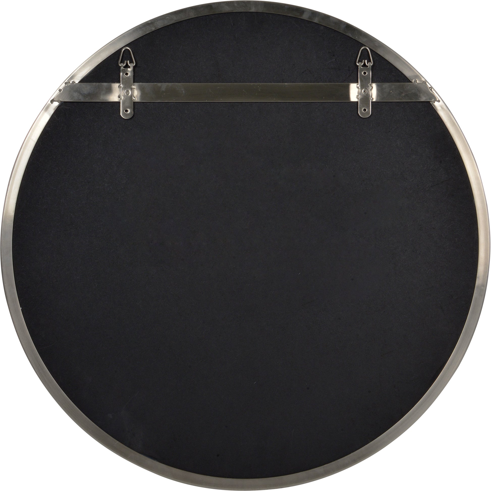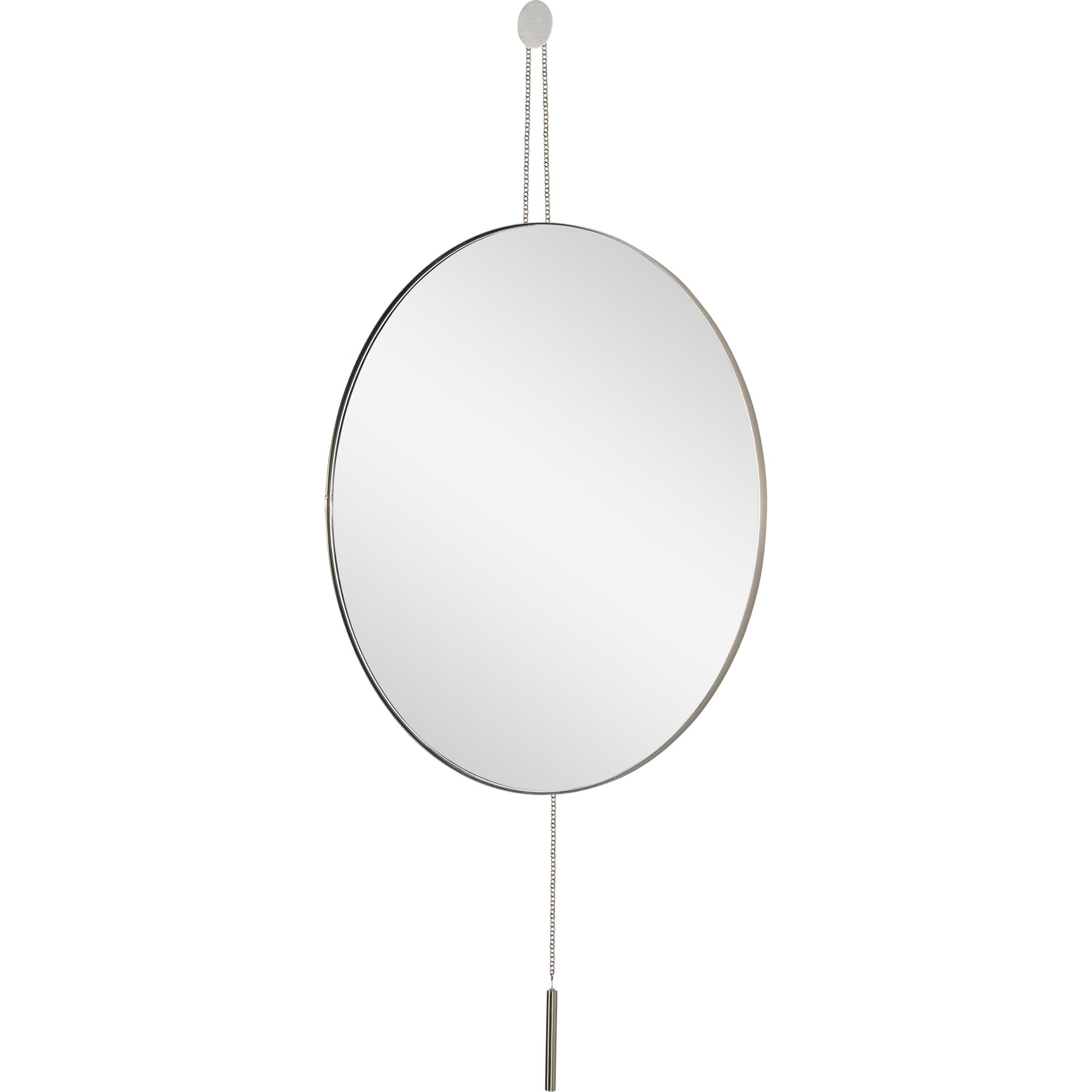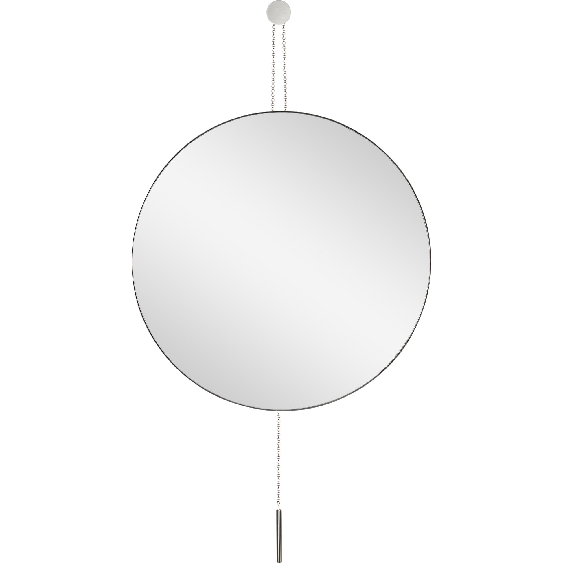 The decorative chain and hook style mirror makes a bold impression hanging above a modern dresser. The satin nickel-plated iron frame shows off the beautiful round shape. The hanging tassel adds an elegant touch to this piece.