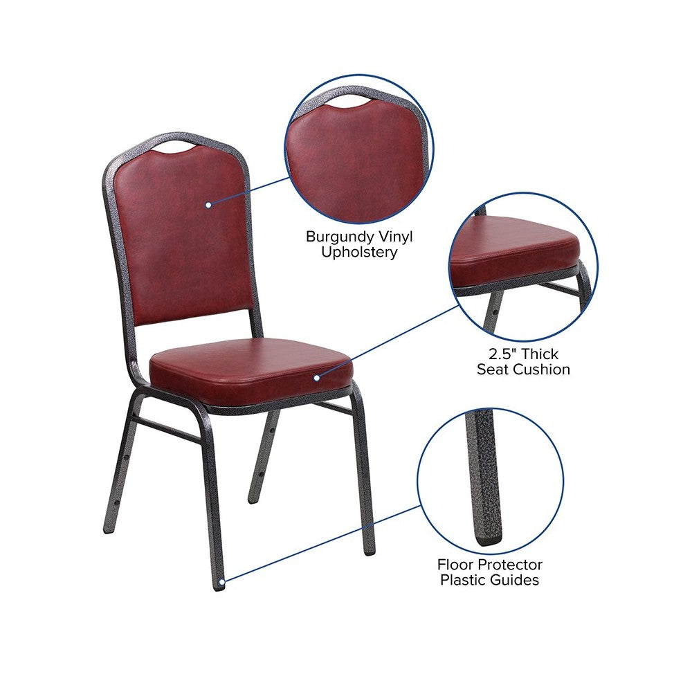 Make an impressive presentation in your banquet hall when clients come to visit your facility with these ballroom chairs. Built for the commercial industry these popular crown back banquet chairs have been tested to hold up to 500 pounds. With a high seating capacity these stack chairs are perfect for the event rental business. This standout hospitality chair can be used as is and still command attention or be dressed up for formal events by placing a chair cover over it. The chair is cushioned with 2.5" thick CAL 117 fire retardant foam and is covered in durable upholstery for high usage. The sturdy frame with gracefully angled legs are made of 16 gauge steel in a lasting powder coated finish. Double support braces reinforce the frame to give it great strength and durability. Bumper guards prevent scratches on the frame when stacked (up to 15 high) and non-marring floor glides protect your floor by sliding smoothly when you need to move the chair. This multi-use stacking upholstered stack chair is an excellent option for churches, banquet halls, training rooms, hotels, convention centers and schools. Add banquet chairs to your home dining table to add a contrasting look to your dining room or kitchen. [FD-C01-SILVERVEIN-BURG-VY-GG]