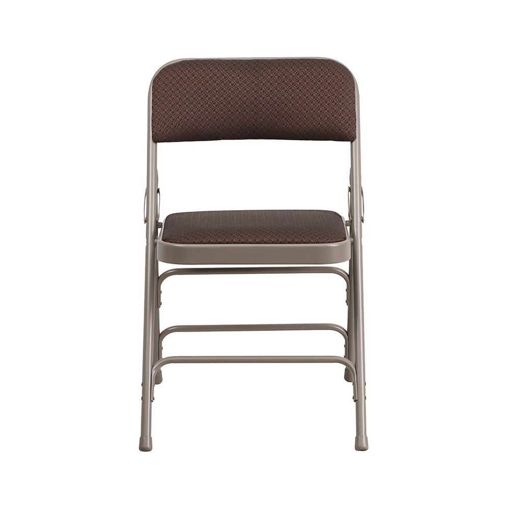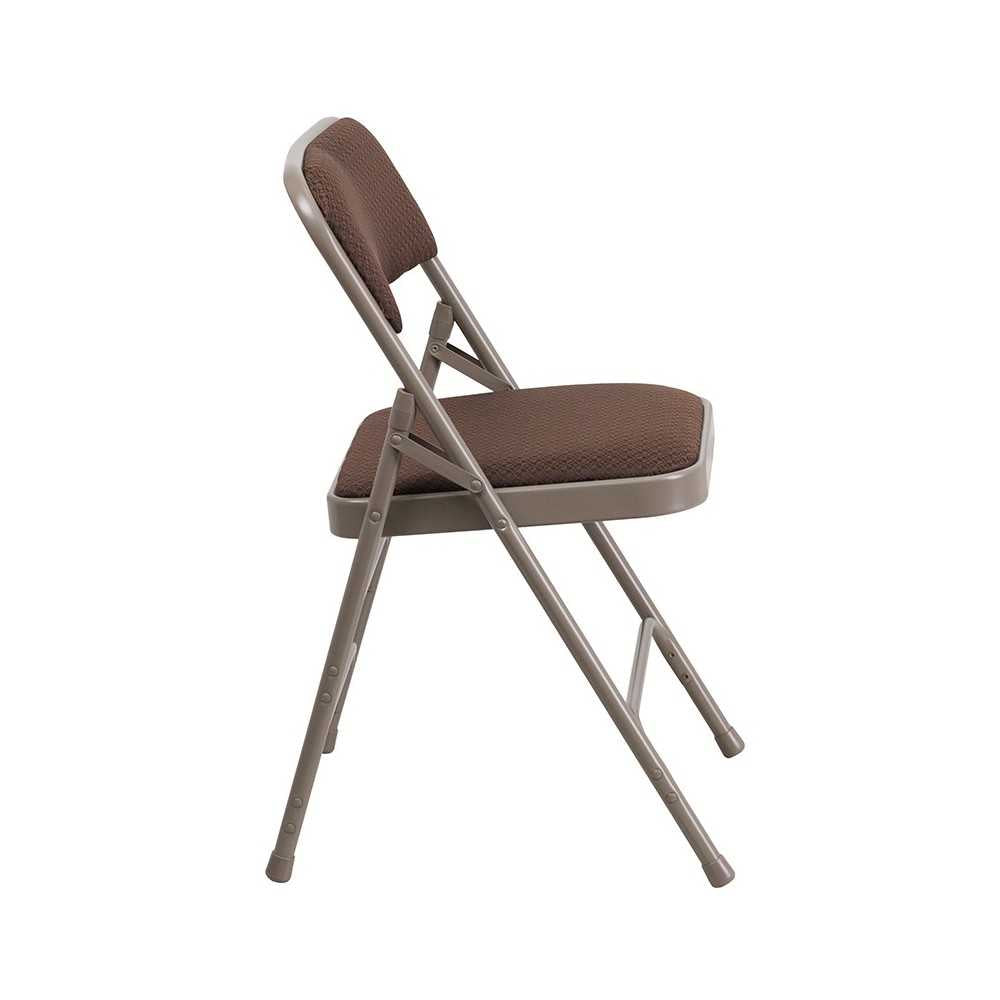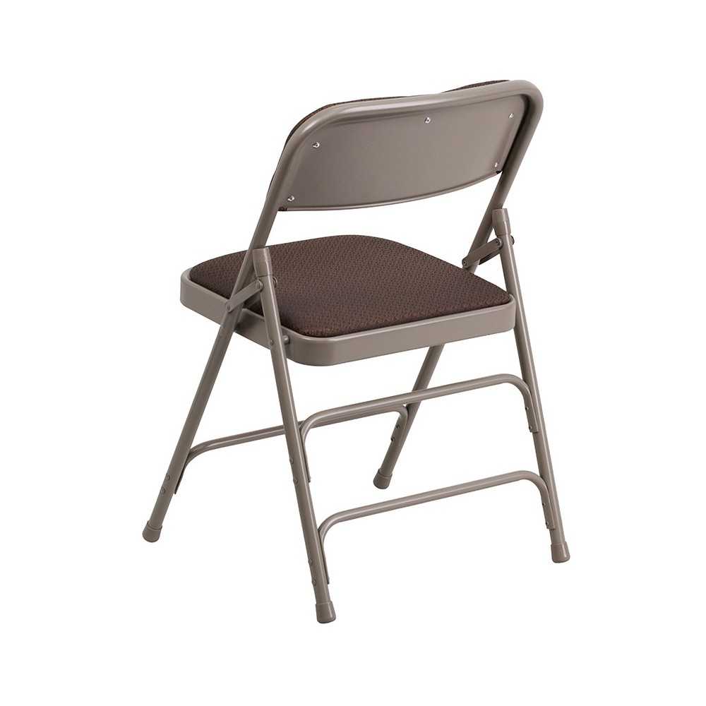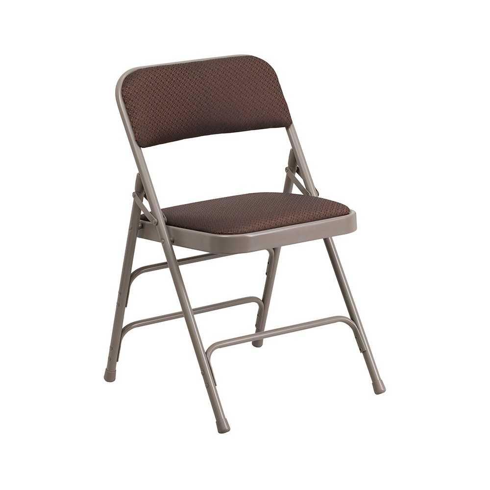 The perfect host is always prepared for that surprise guest and this classic upholstered metal folding chair is the perfect option to accommodate additional guests. These portable chairs are popular at community centers due to their durability, compact storing capability and ease of setup. Suitable for everyday use and all celebrations you can host holiday parties, birthdays, girl's night in and game night. Host fantastic outdoor events while the weather is nice. Padded folding chairs provide comfort during extended meetings and social gatherings. Its 18-gauge curved powder coated steel frame is triple braced, and double hinged with leg strengthening support bars to hold up to 300 pounds. Non-marring floor glides on the legs protect your floors by sliding smoothly when you move them. Built for commercial use these attractive chairs are a smart seating solution for your next business meeting as well as in the home for family gatherings and other social events. After outdoor events, store indoors to protect the frames from extreme moisture. With nothing to assemble these chairs come ready to service your needs. [AW-MC309AF-BRN-GG]