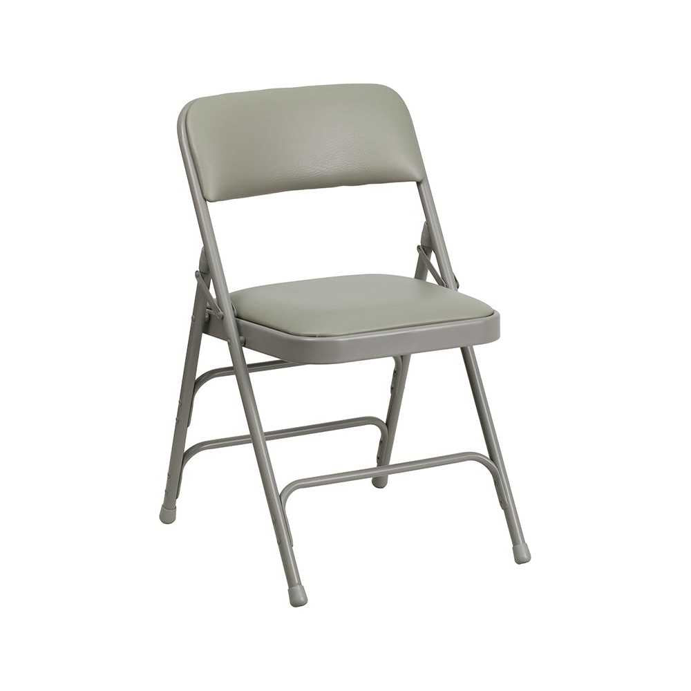 Host Thanksgiving at your house and leave out "bring your own chair" on the invite we've got you covered with these padded folding chairs. These heavy-duty metal folding chairs are built for commercial businesses who host a myriad of events and need to accommodate people of varying sizes. Portable chairs are ideal in community centers to transport from storage to venue floor. Change the scenery with these outdoor metal chairs by taking the party outside. Take care of your chairs so they last you many years by storing indoors. Its 18-gauge curved steel frame is triple braced with leg strengthening support bars to hold up to 300 pounds while the non-marring floor glides protect your flooring from scuffs and scrapes. Celebrate all family events at your home for guests to sit comfortably atop these upholstered folding chairs. These chairs come assembled to be of service as soon as they're delivered. [HA-MC309AV-GY-GG]