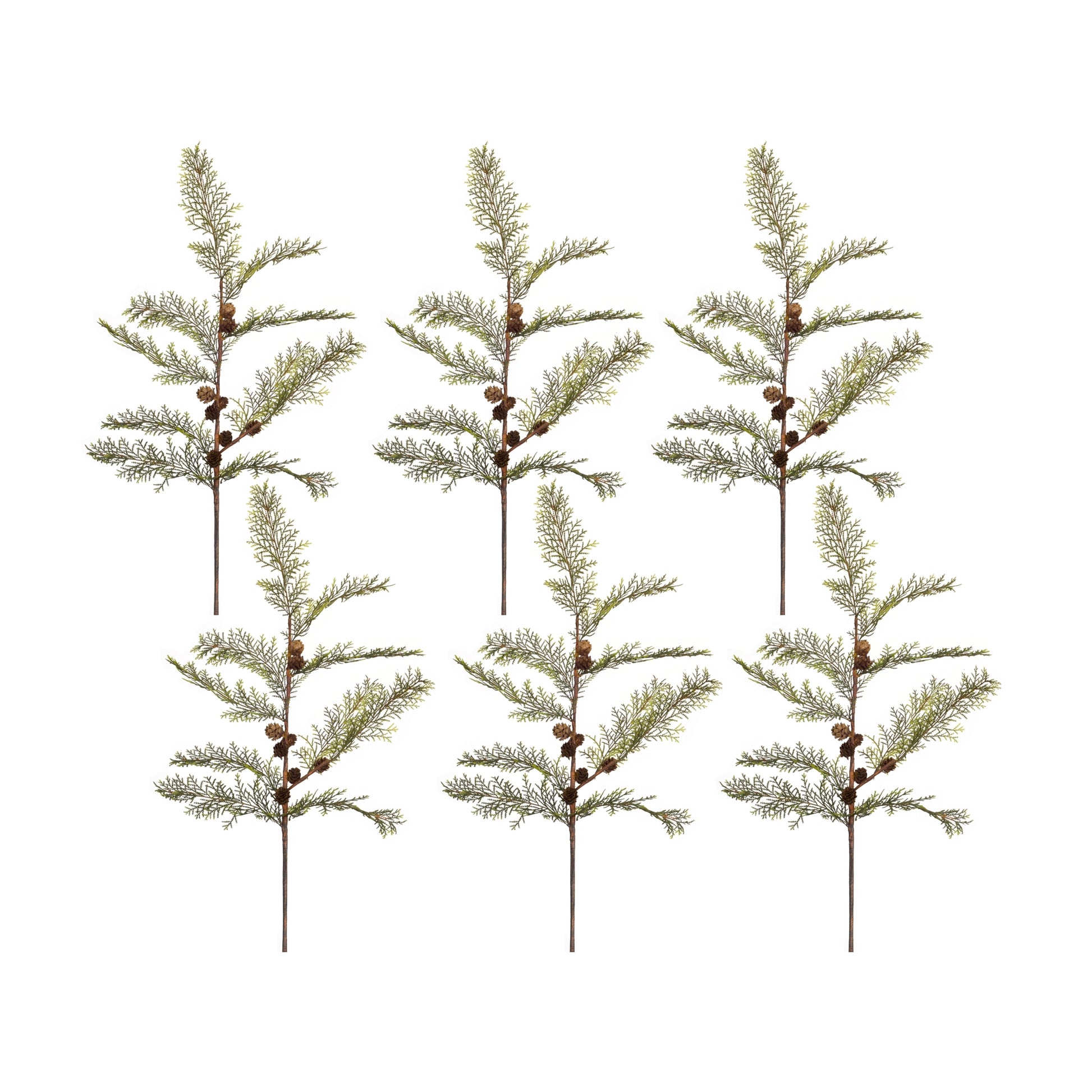 Add a pop of natural color to your holiday decor with this beautiful set of Cypress Sprays with Pine Cones. Featuring six pieces, this set would make a great addition to your Christmas centerpiece or holiday floral vase. The varigated pine branches paired with the realistic pinecones is the perfect combination to create a stunning display. Add this set to a vase to add a touch of nature to the room, or use them to accent and draw attention to your other Christmas decor.