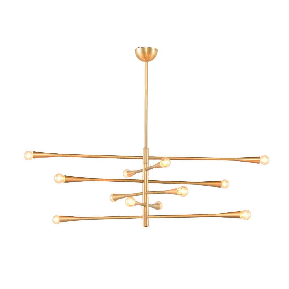 The Dahlia pendant presents a graceful formality in horizontal lines. Six slim golden trumpet arms fan out with balanced precision, projecting a refined lightness of form. Easily adjustable large and small arms allow for multidirectional lighting and unlimited design possibilities.