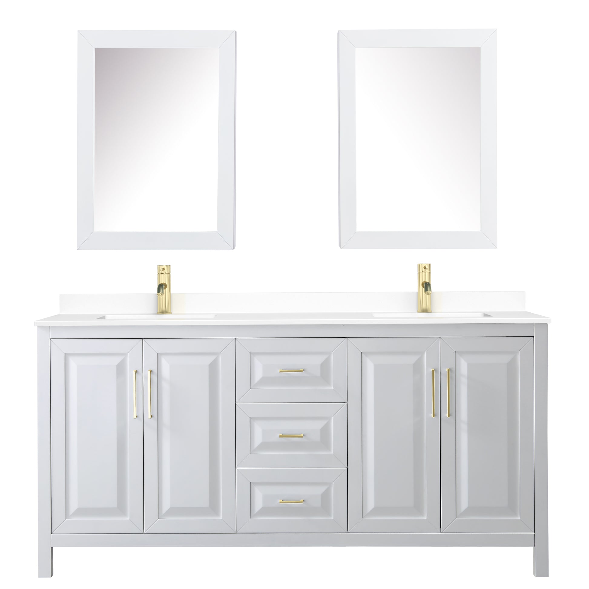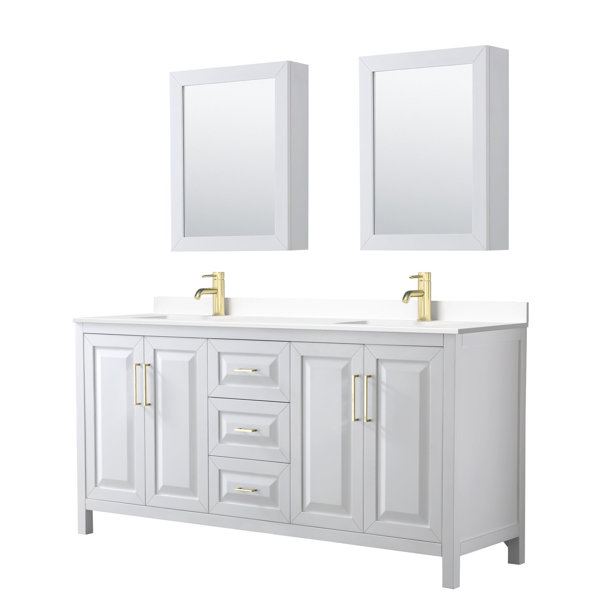 Daria 72" White Double Vanity, White Marble Top, Medicine Cabinets, Gold Trim