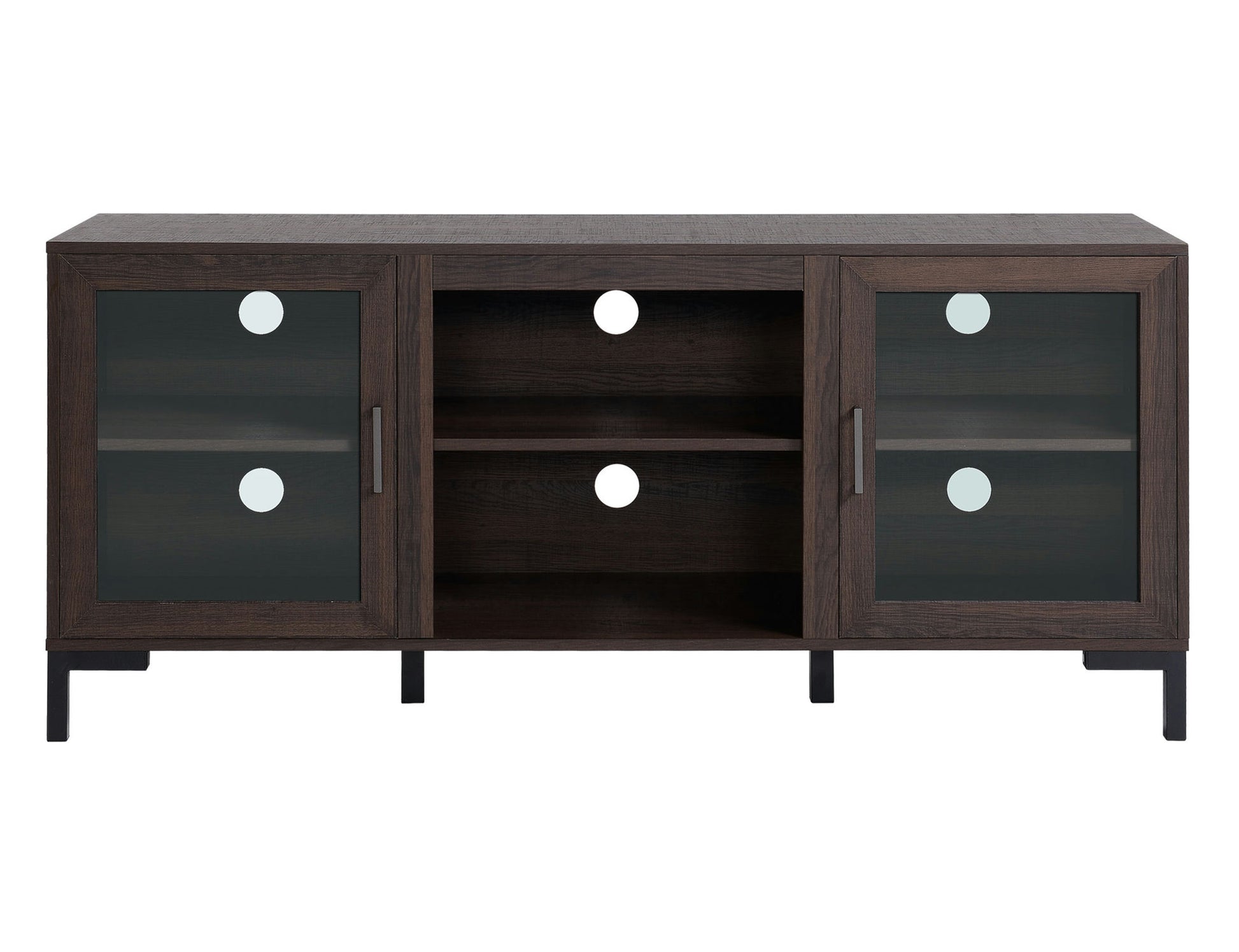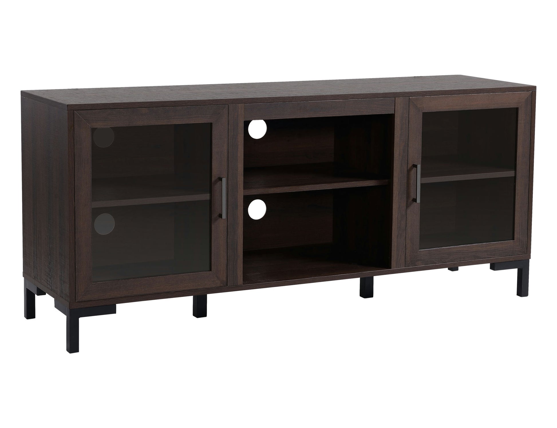 This TV Stand fits right into any corner of your living area to create the perfect look. This Laminated Wood console features one open shelving area,center and side adjustable shelves to house all of your media components and accessories. Made to accommodate most flat panel TVs up to 50", this console is simple, functional, perfect. There’s also easy cable management. Lots of storage to keep your components and accessories tidy and organized. This unit is sure to make the perfect addition to any living or media room.