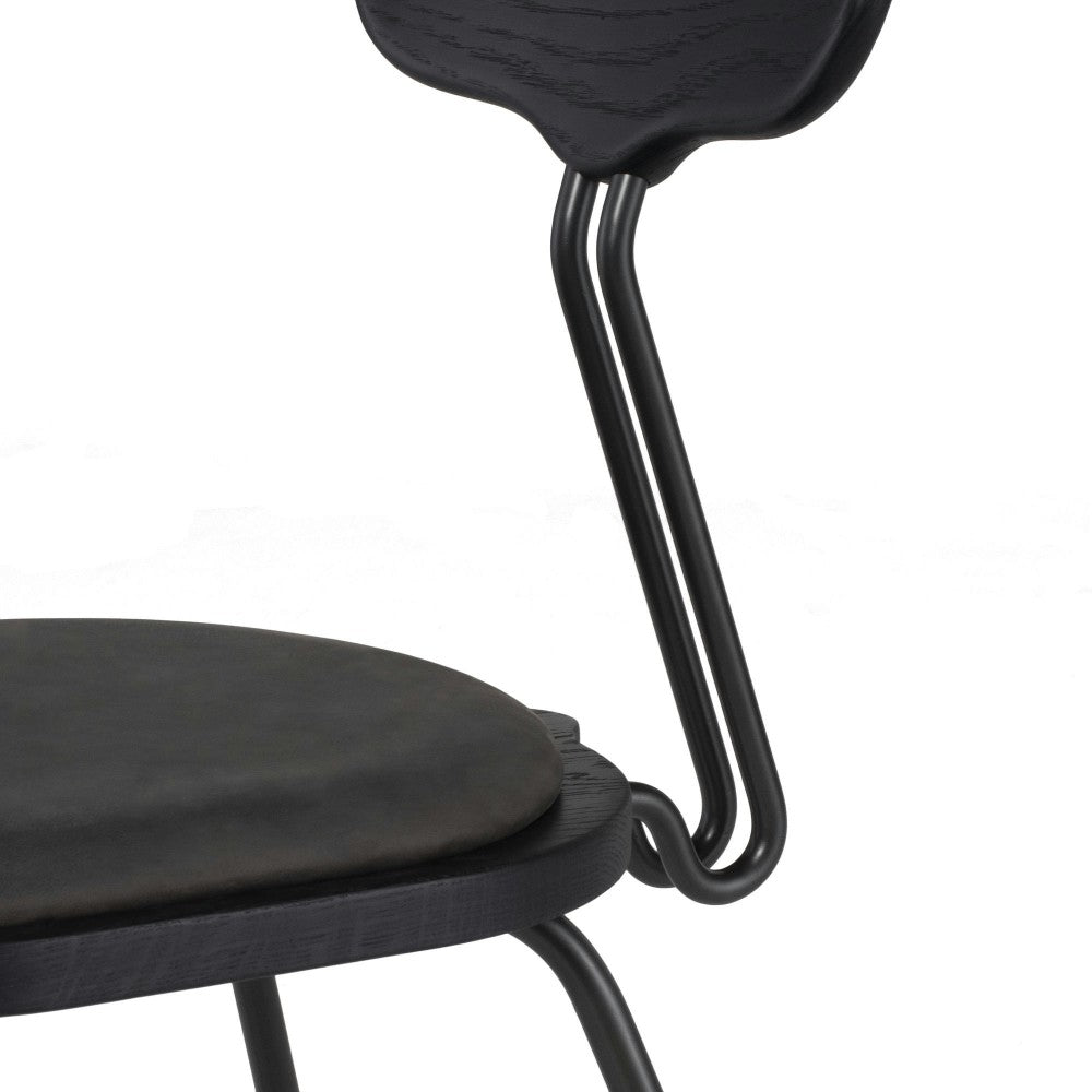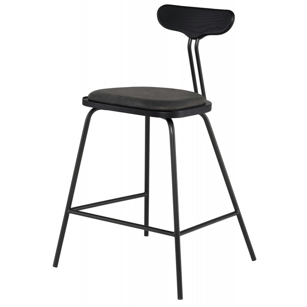 Dayton counter stool features a comfortable strorm black leather cushion and a charred oak backrest.