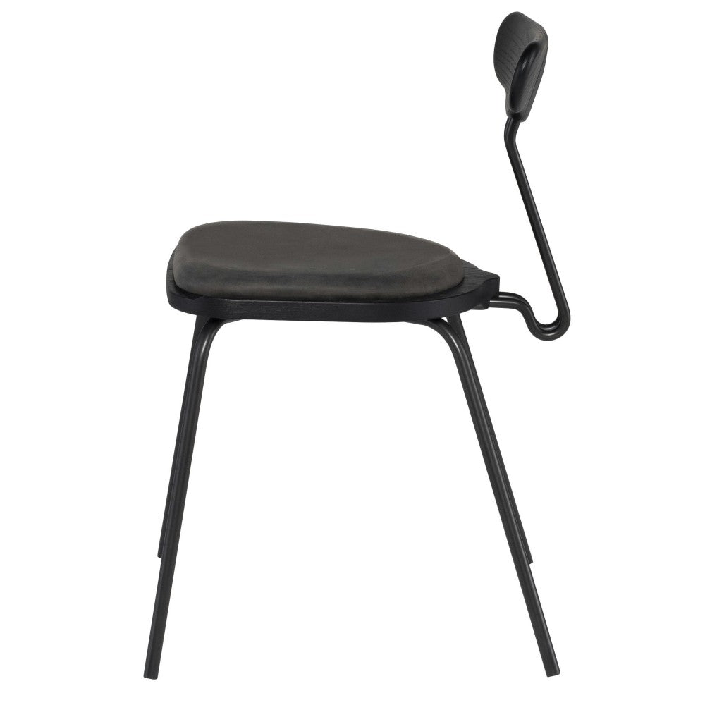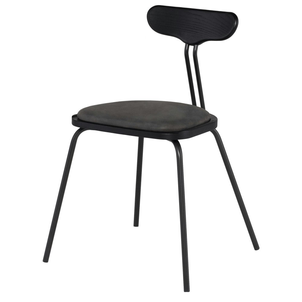 Dayton dining chair features a comfortable strorm black leather cushion and a charred oak backrest.