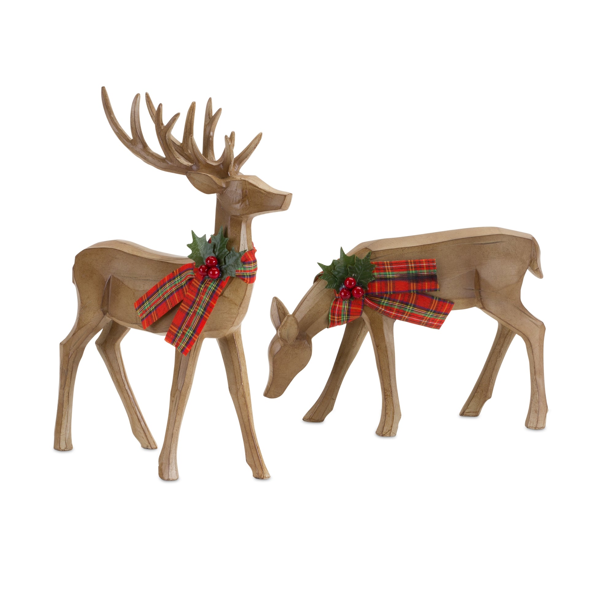 Add a modern touch of nature to your holiday decor with this beautiful set of Deer Figurines. Featuring two assorted designs, the carved faux wood design paired with the plaid ribbon accent is the perfect combination to create a stunning Christmas display. The quality polyresin and metal composition is sure to last for seasons to come. Display the pieces together to make a statement, or display them alongside your other holiday decor to add character to the space.