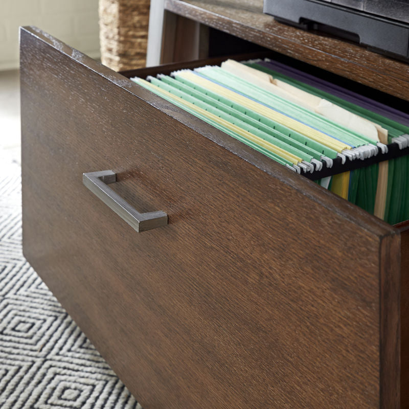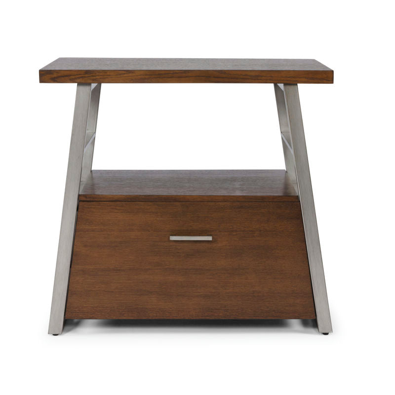 - Single file drawer with an angled front panel that mirrors the angled legs and has full-extension guides