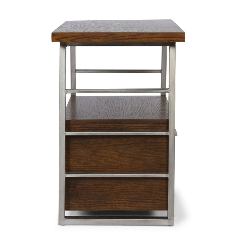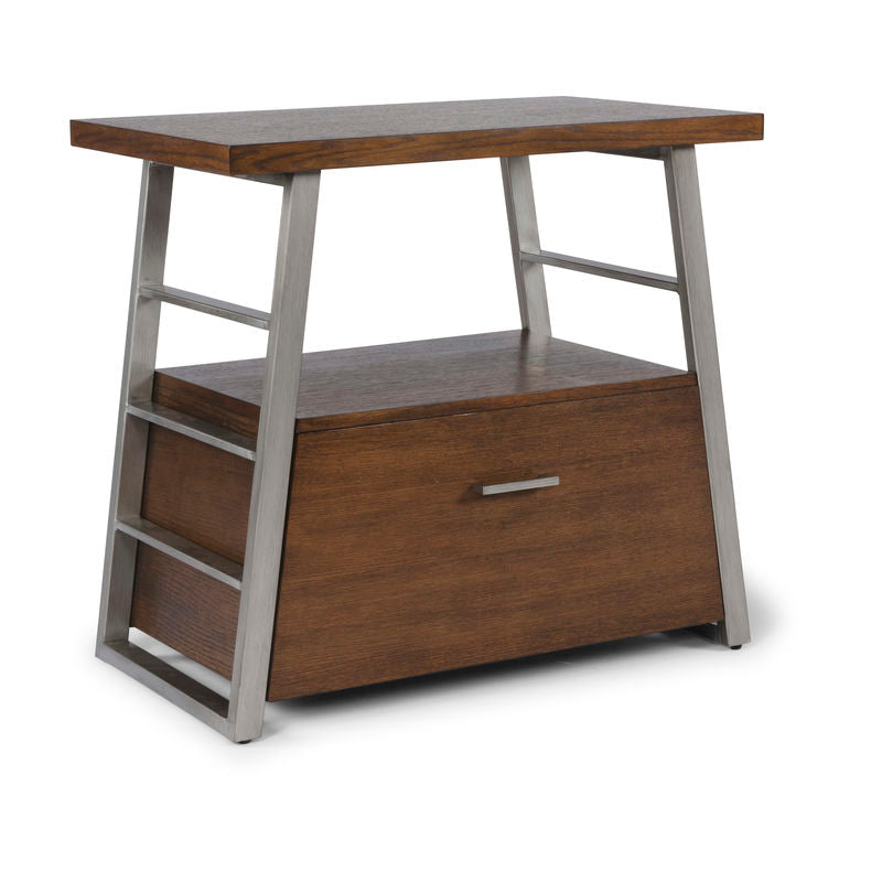 A unique contemporary design using angled metal leg frames creates a distinctive look in this Degree File Cabinet by homestyles. Crafted of solid hardwood veneers over engineered woods and finished in a mid-century modern brown tone. The metal tube frame has an antiqued gray powder-coated paint finish. There is a single file drawer with an angled front panel that mirrors the angled legs and has full-extension guides. The drawer accommodates both legal- and letter-sized files, with two antiqued nickel-finished drawer pulls. Arrives at your door by parcel delivery service. Finish and measurements may vary. Assembly required. Measures: 30"H x 32"W x 20"D.