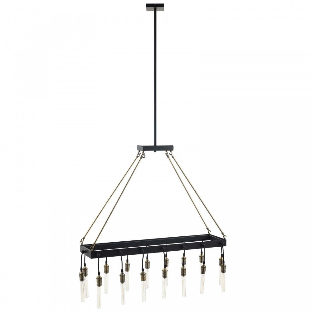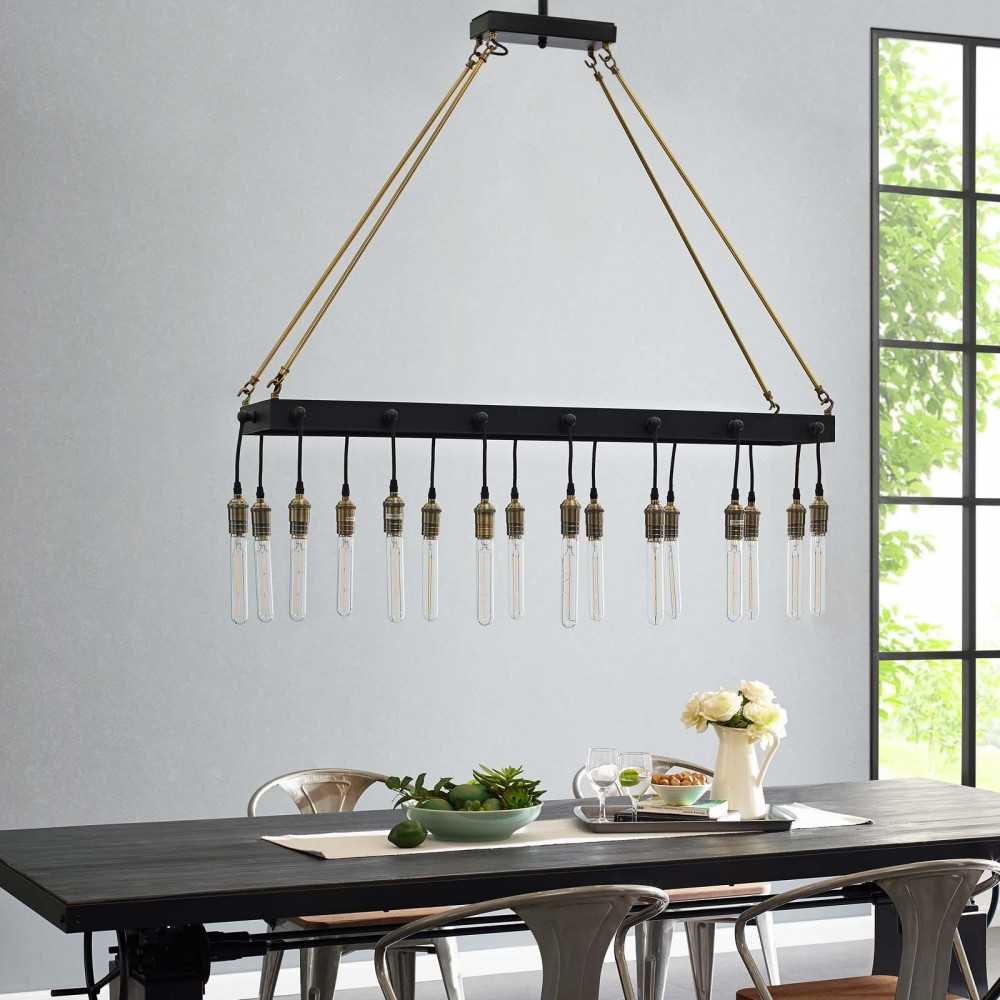 Light up your living space with the Demarcate Modern Farmhouse Pendant Chandelier. Featuring a matte black metal construction and flush wall mount, Demarcate is a stylish ceiling light fixture perfect for the modern farmhouse dining room, entryway or living room. Sixteen antique brass sockets hang suspended from the clean-lined frame casting illumination upon your surroundings. This industrial modern pendant chandelier requires sixteen E26 25-watt bulbs (not included).