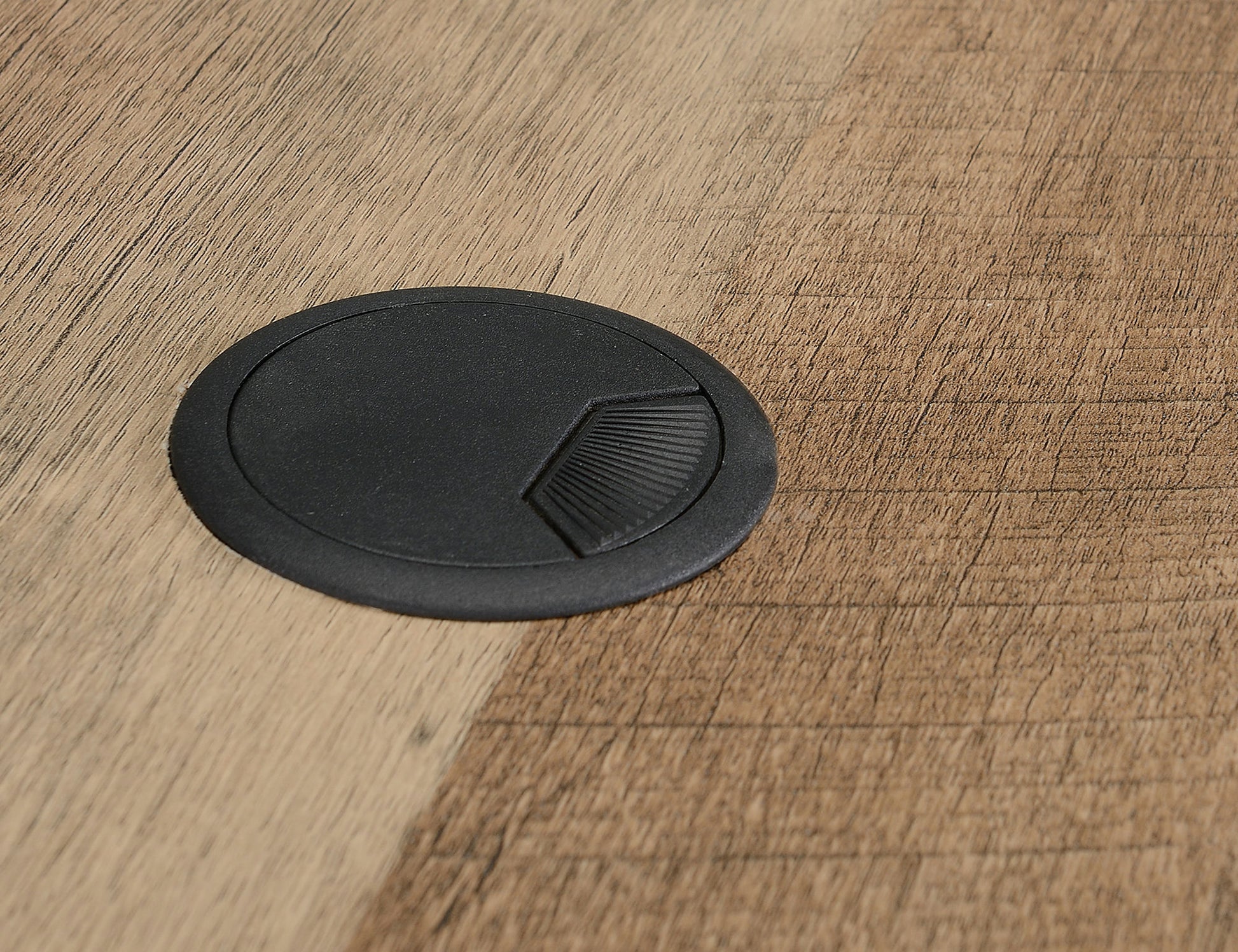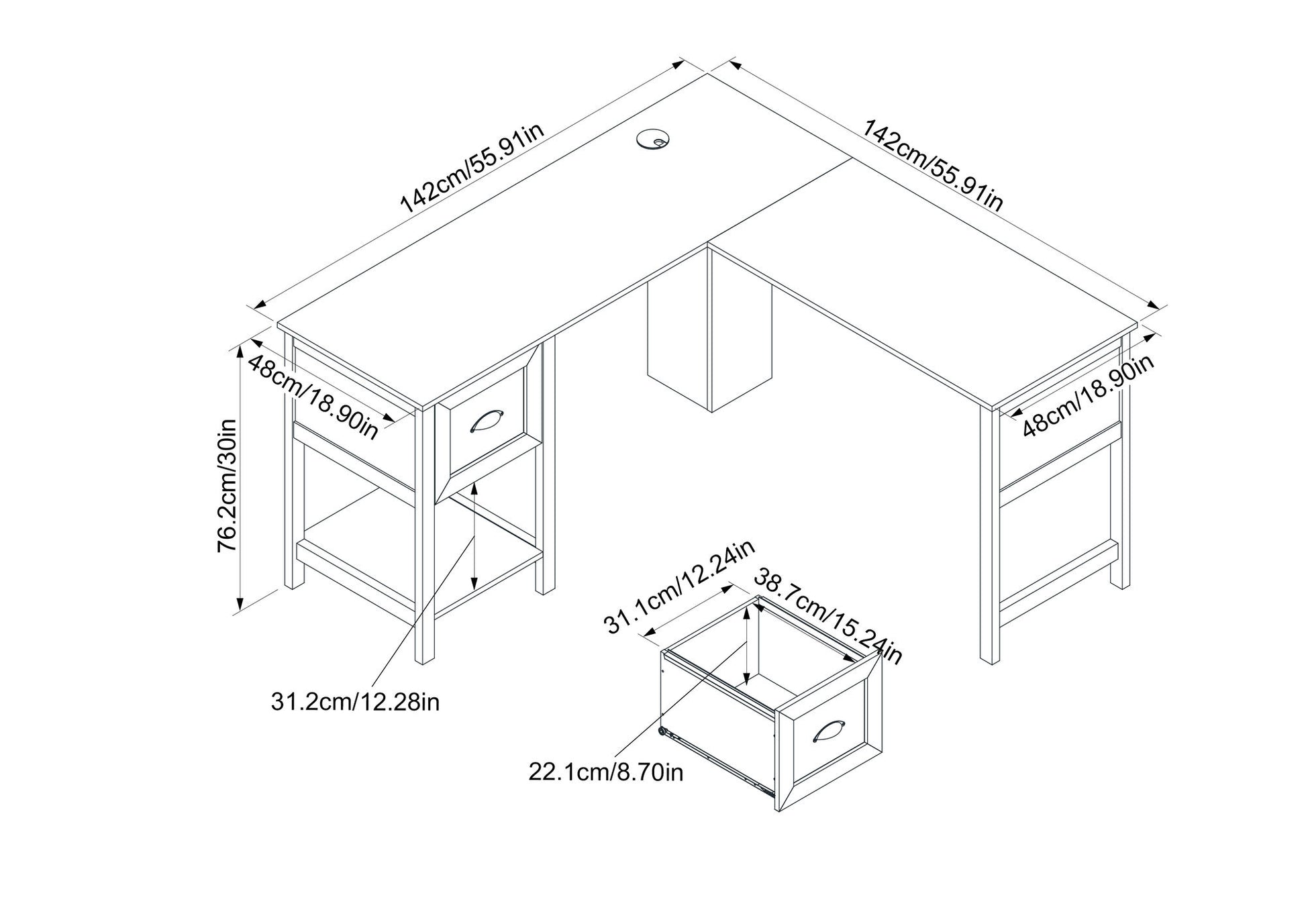 This rustic oak look L Desk is sure to make a statement in any home office or workspace. L shape allows this to fit comfortablly in most corners. Drop thru chord grommets for cable management and file drawer make this piece versatile as it is beautiful.