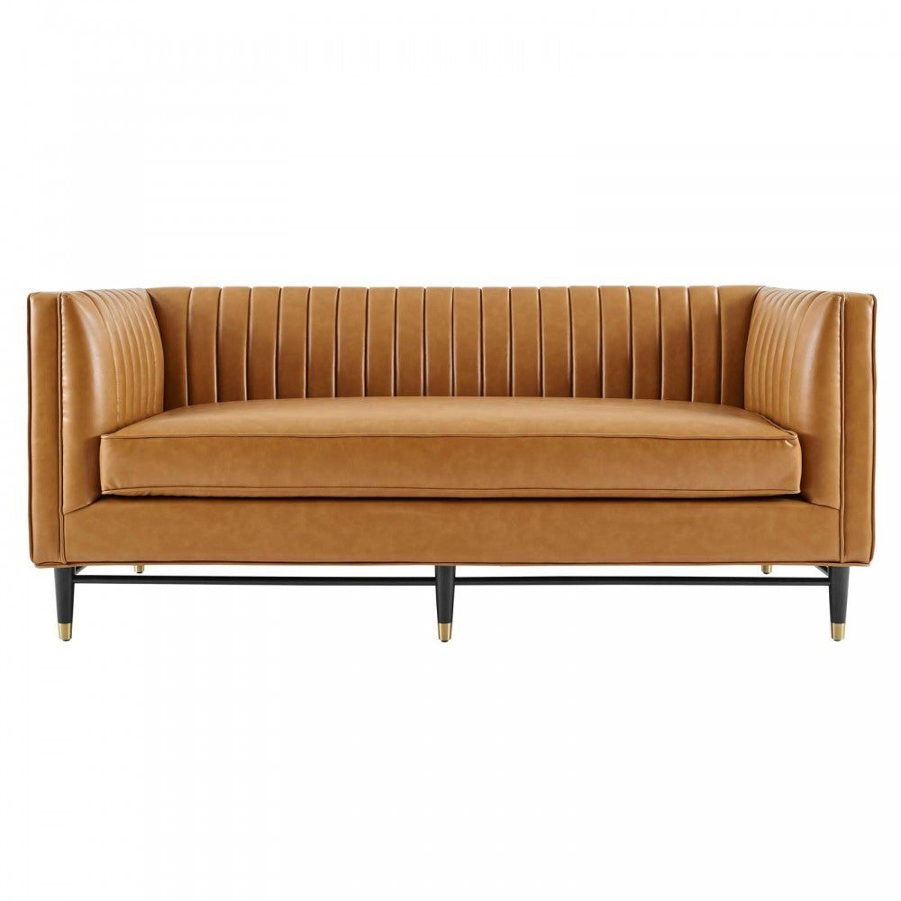 Introduce the flowing lines of the Devote Channel Tufted Vegan Leather Loveseat to your living room, bedroom, or office decor. Putting a retro twist on classic tufting, this loveseat is enriched with vertical channel tufting that adds visual depth and glam deco style to any space. This two-seater sofa is upholstered in vegan leather and padded in dense foam for a premium seating experience. Durably crafted, this loveseat rests atop black rubberwood legs with gold stainless steel sleeves that add subtle interest. Includes non-marking foot caps. Assembly required. Loveseat Weight Capacity: 881 lbs.