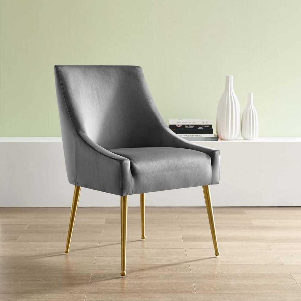 Gently sloping arms cascade down from the flowing design of the Discern Performance Velvet Dining Chair. Solidly constructed from wood and plywood, Discern comes with dense foam padding upholstered in stain-resistant performance velvet. Complete with splayed brushed gold stainless steel legs and matching decorative handle on the back of the chair, Discern is a soft and durable addition to the dining room, kitchen entryway, living room, bedroom, home office, or vanity. Create a cozy seating experience with this versatile dining accent chair with non-marking foot caps.
