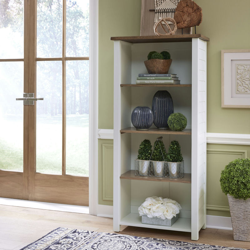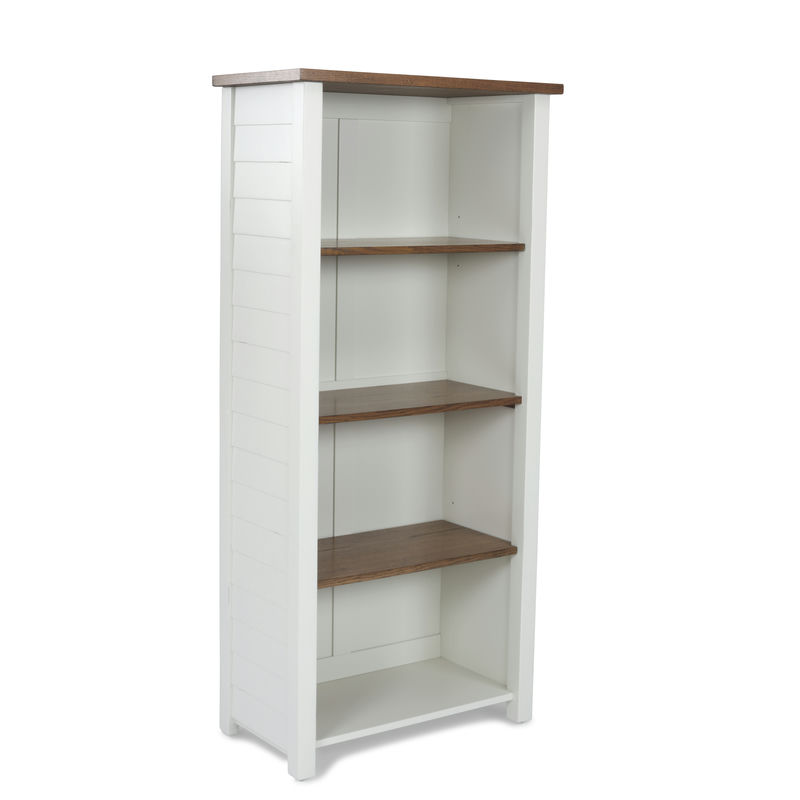 Classic coastal New England styling with shiplap look panels. Crafted from poplar solids and oak veneer, with engineered wood. Off white painted finished with brown oak stained top, and shelves. Center shelf is stationary for structural support, while the other 2 shelves are adjustable. Shelf depth is 13.5" to provide multi-purpose usage. Size is ideal for almost any room of the house. Note finish and measurements may vary slightly. Assembly required. Arrives to your door by parcel delivery service. W-30", D-16", H-64"