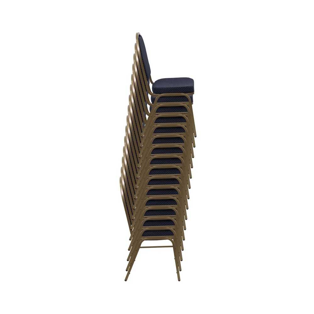 This beautiful, supremely comfortable banquet chair will ensure your guests have an enjoyable experience whether you're hosting the bride and groom, celebrating a sweet 16 or hosting the family reunion this well built chair is up to the task. The chair's seamless back panel and cushioned seat are generously padded and covered in durable navy patterned fabric upholstery, The gently curved, dome back design gives a stylish look to any venue. Its sturdy 16 gauge steel, gold powder coated frame, with gracefully angled legs, has been tested to hold up to 500 pounds and floor protector glides protect your flooring by sliding smoothly when you need to move the chair. This chair is stackable for easy storage making it an excellent choice for event venues, hotel lobbies, banquet halls, conference facilities and worship centers. [FD-C03-ALLGOLD-H203774-GG]