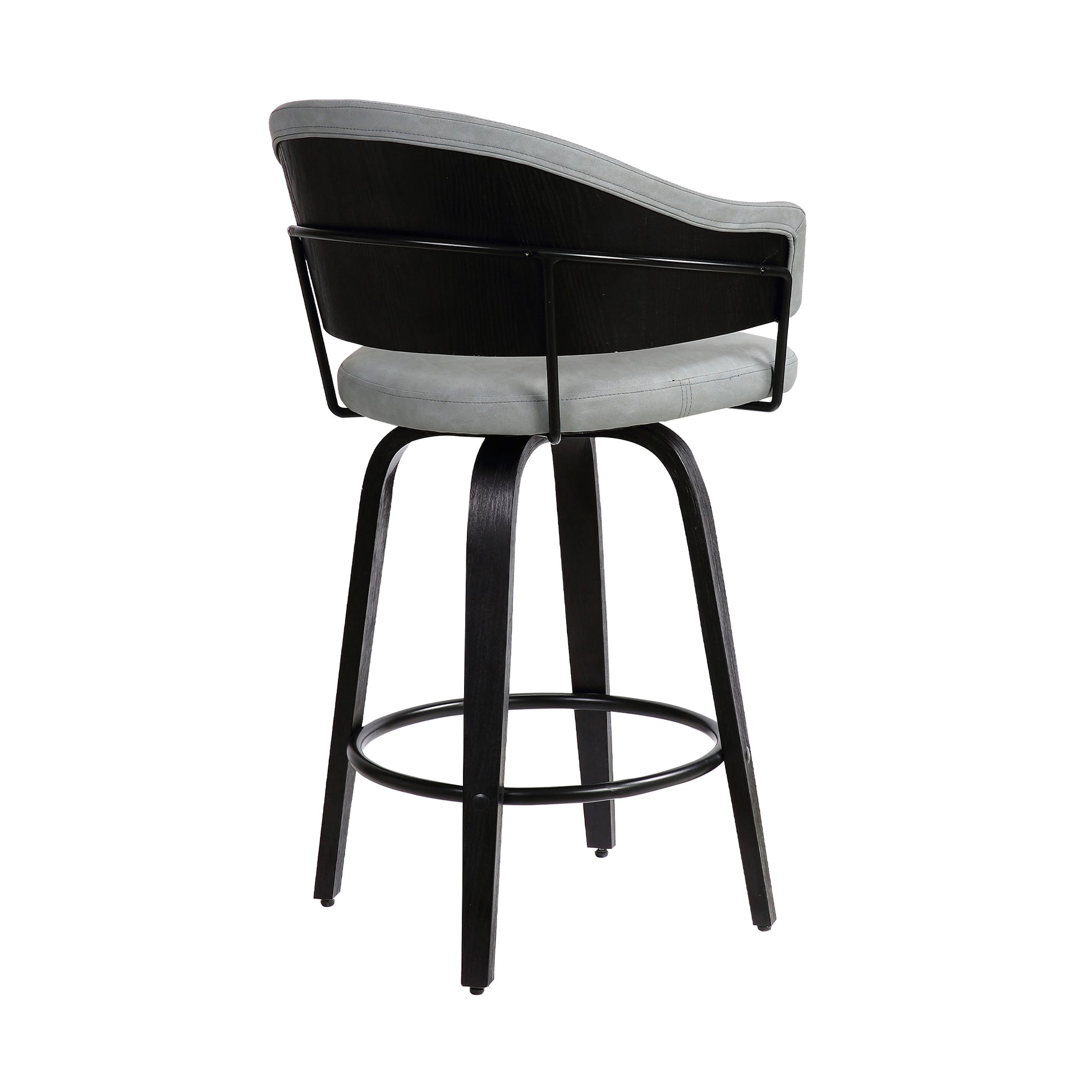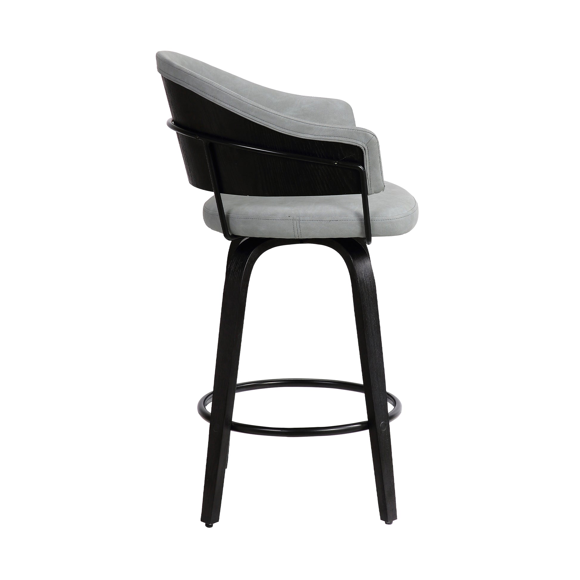The Armen Living Doral contemporary barstool is a practical, yet stylish piece designed for both comfort and aesthetic pleasure. The Doral's durable black coated wood finished exterior finds good company with the barstool's sleek dark Gray faux leather upholstered seat and back. The Doral has swivel functionality with Black Steel finished footrest beautifully compliments the elegant, straight leg design of this impressive stool. Featuring a foam padded, higher back design, the Doral offers optimal lumbar support without compromising on the stool's contemporary appearance.