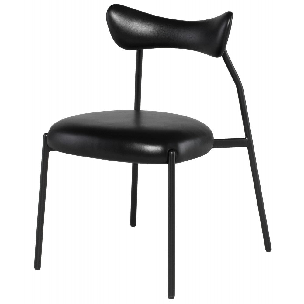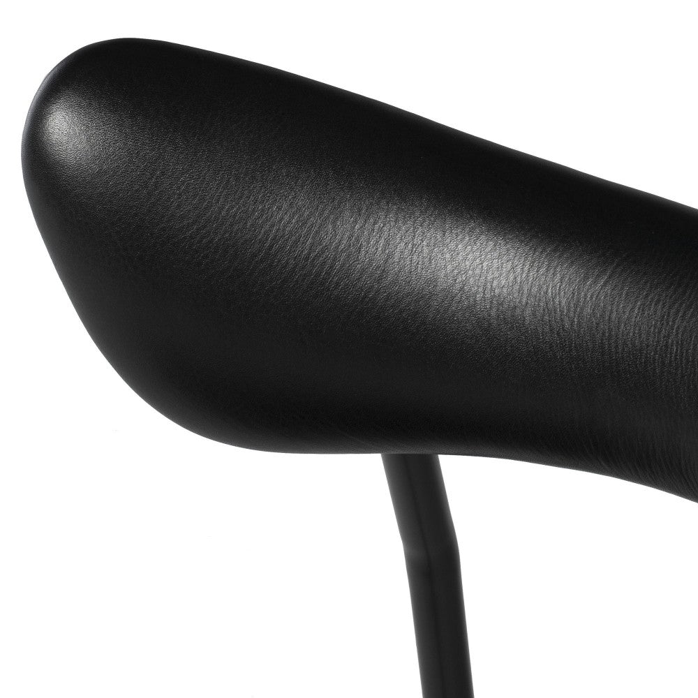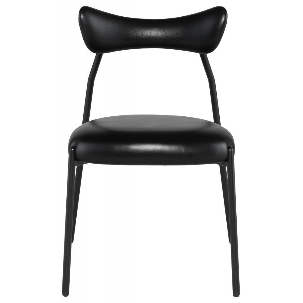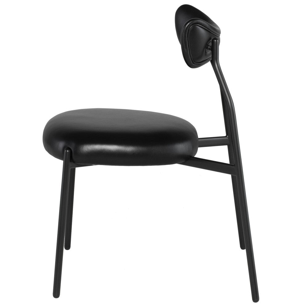 The Dragonfly Dining Chair features a thin and enveloping backrest. Its frame is built with a black steel tube, while the seat comes in either leather or fabric.