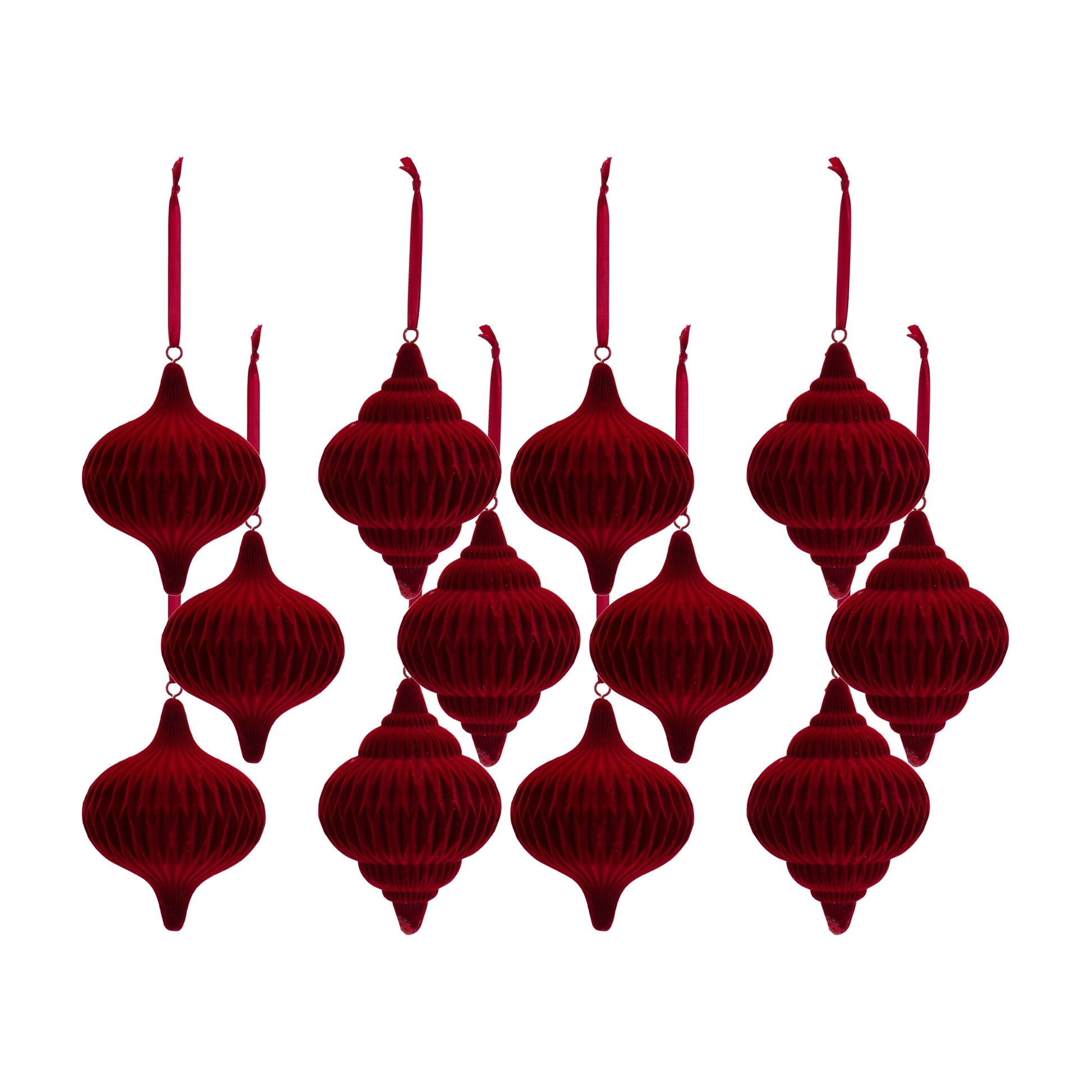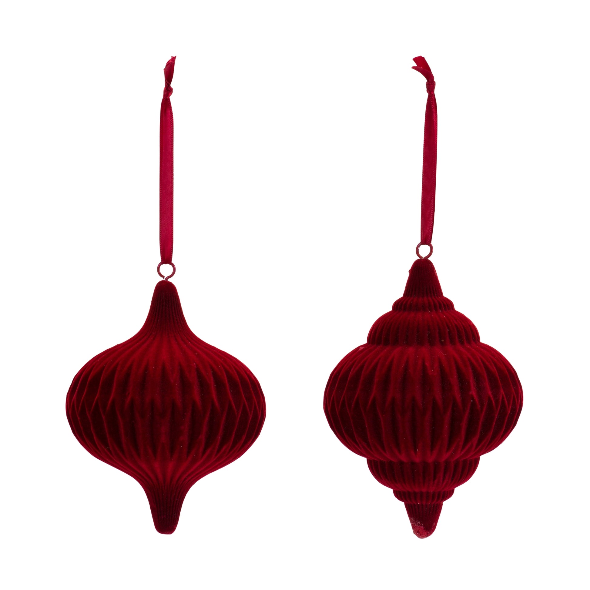 Adorn your Christmas Tree with this beautiful set of Onion Drop Ornaments. Featuring two assorted designs, the traditional onion drop ornament design paired with deep red tone with ribbon hanger accent makes this set the perfect addition to your holiday tree decor. The pieces can be used as gifts for friends to cherish, or you can display the set on your own Christmas tree and enjoy them for years to come.