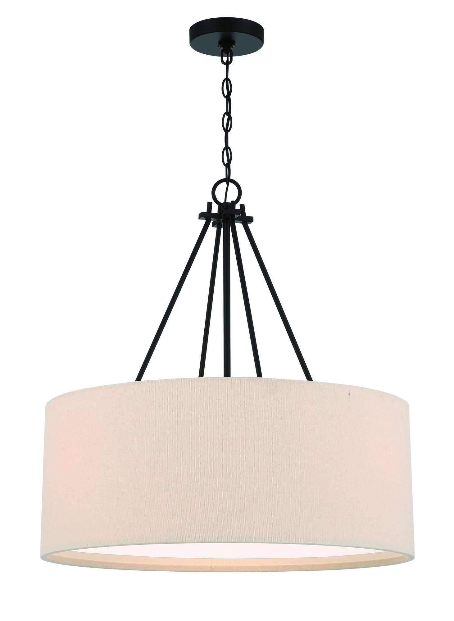The Duke pendant collection from Craftmade welcomes you with the curves of the crisp linen hardback drum shade complimenting the angular metal frame suspended from up to 6' of chain. The three light pendant available in 18" or 24" with white frost acrylic diffuser delivers warm illumination without the bright glare of exposed bulbs.