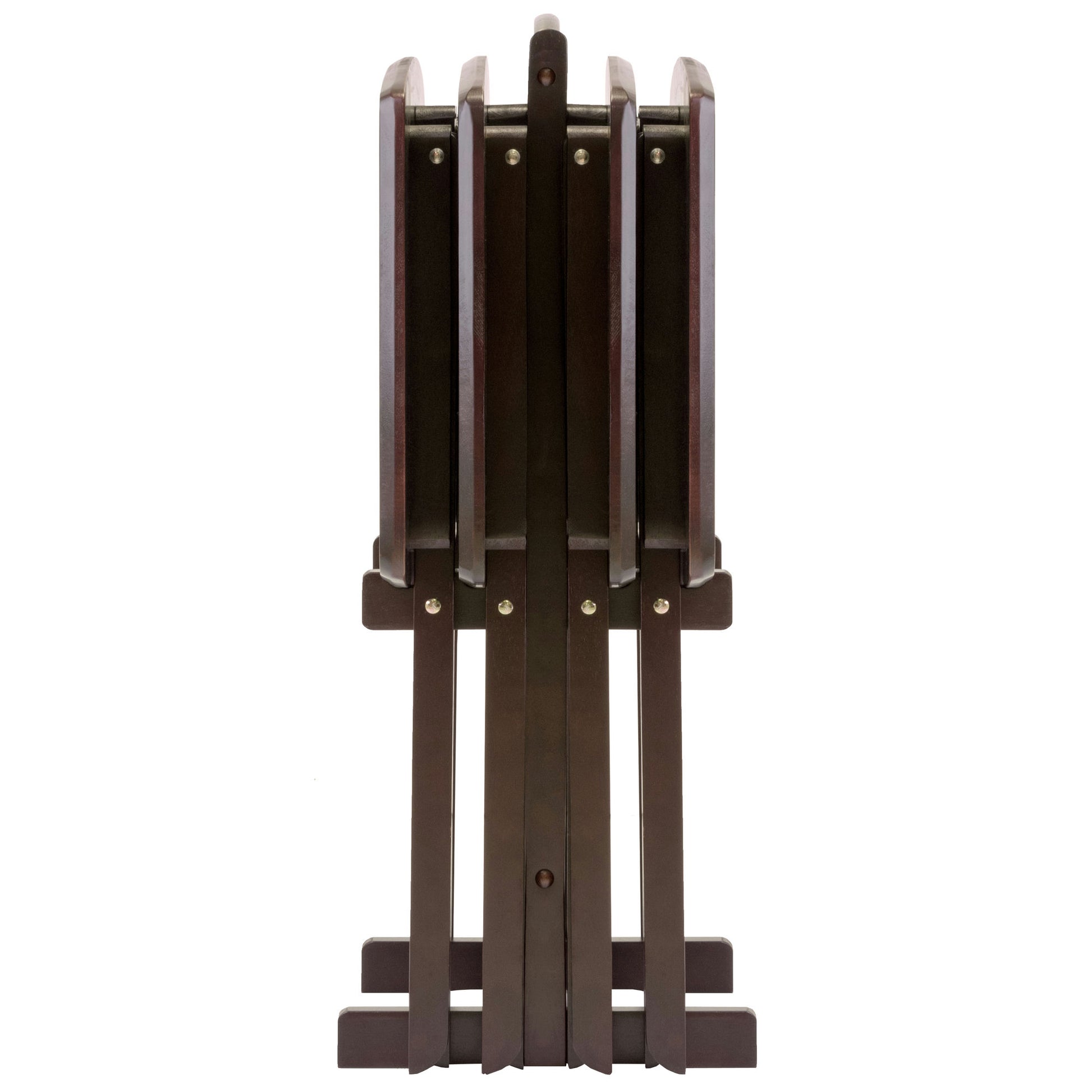 Gently curved sides and rounded corners are featured in the Dylan 5-Piece Snack Table Set. The foldable tables are oversized to hold a meal and drink comfortably or for setting out plates of appetizers when entertaining. The set comes with a stand to store the tables when not in use, and all are made of Solid Wood in a rich Espresso finish.