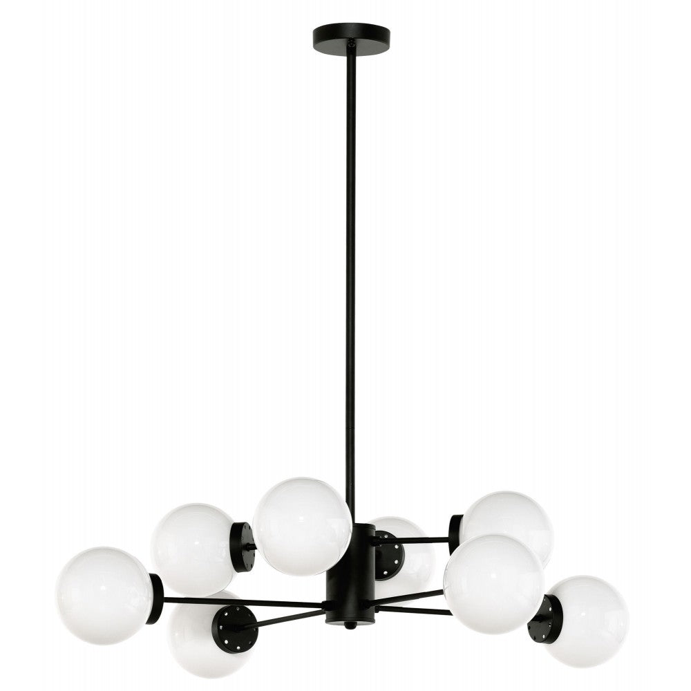 The Dylan pendant features 8 round white-glass shades, radiating outward from a simple, cylindrical stem presenting an elegant contemporary European bistro inspired aesthetic.